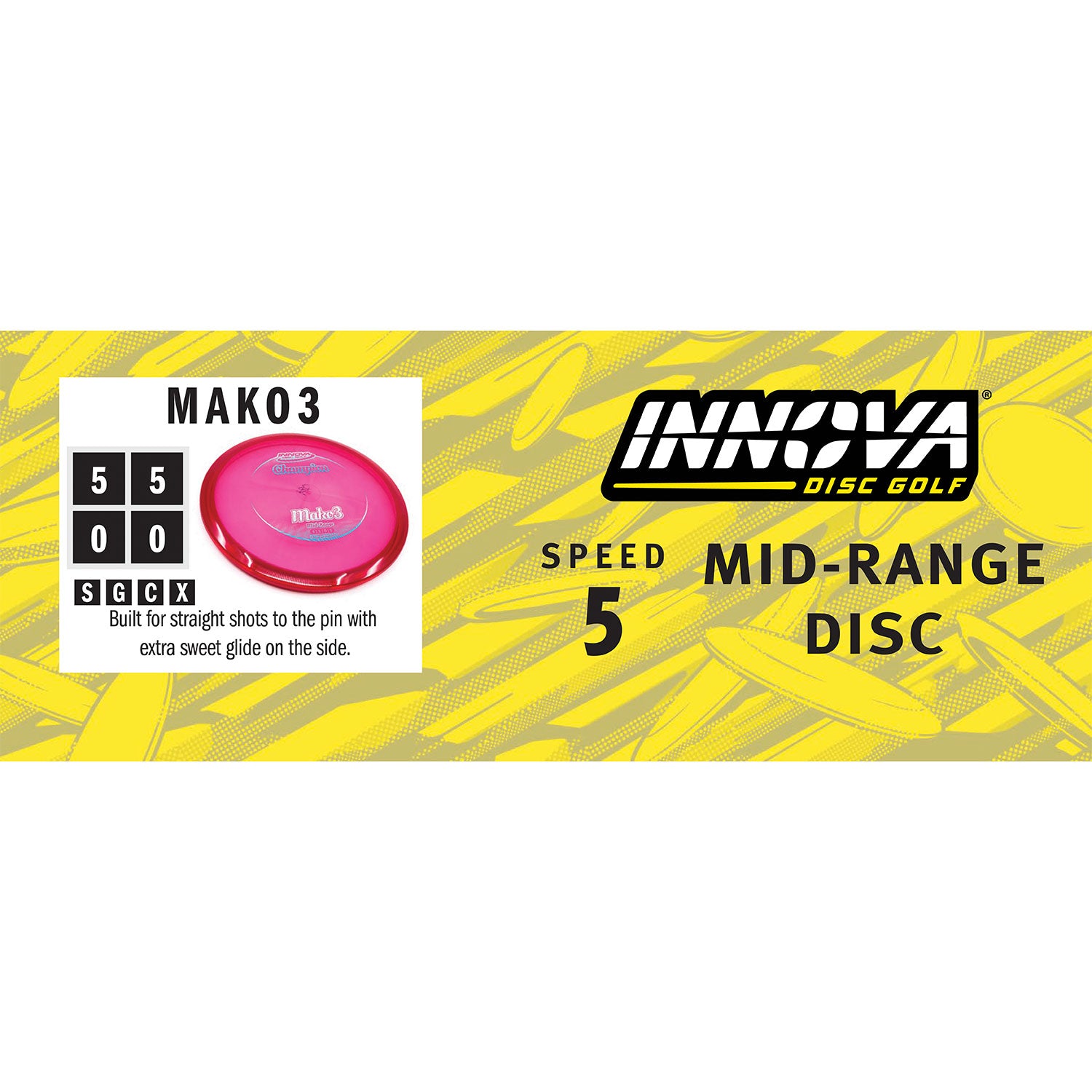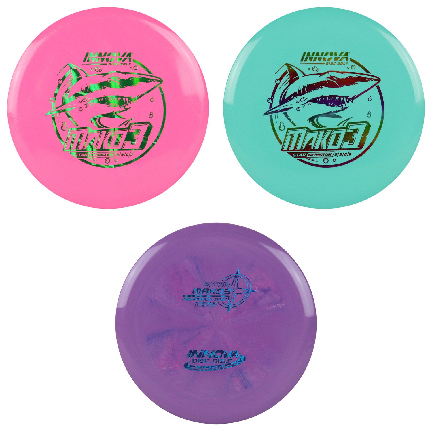 The Mako3 is the faster, low profile version of the remarkably straight flying Innova Mako. The Star line is created with a special blend of grippy, resilient polymers. Star plastic offers the same outstanding durability of our regular Champion plastic, plus improved grip like our Pro plastic. Star discs have the same flight characteristics as Champion discs, but are slightly less firm. High performance, longevity, and superior grip make Innova Star line discs a great choice for your game.