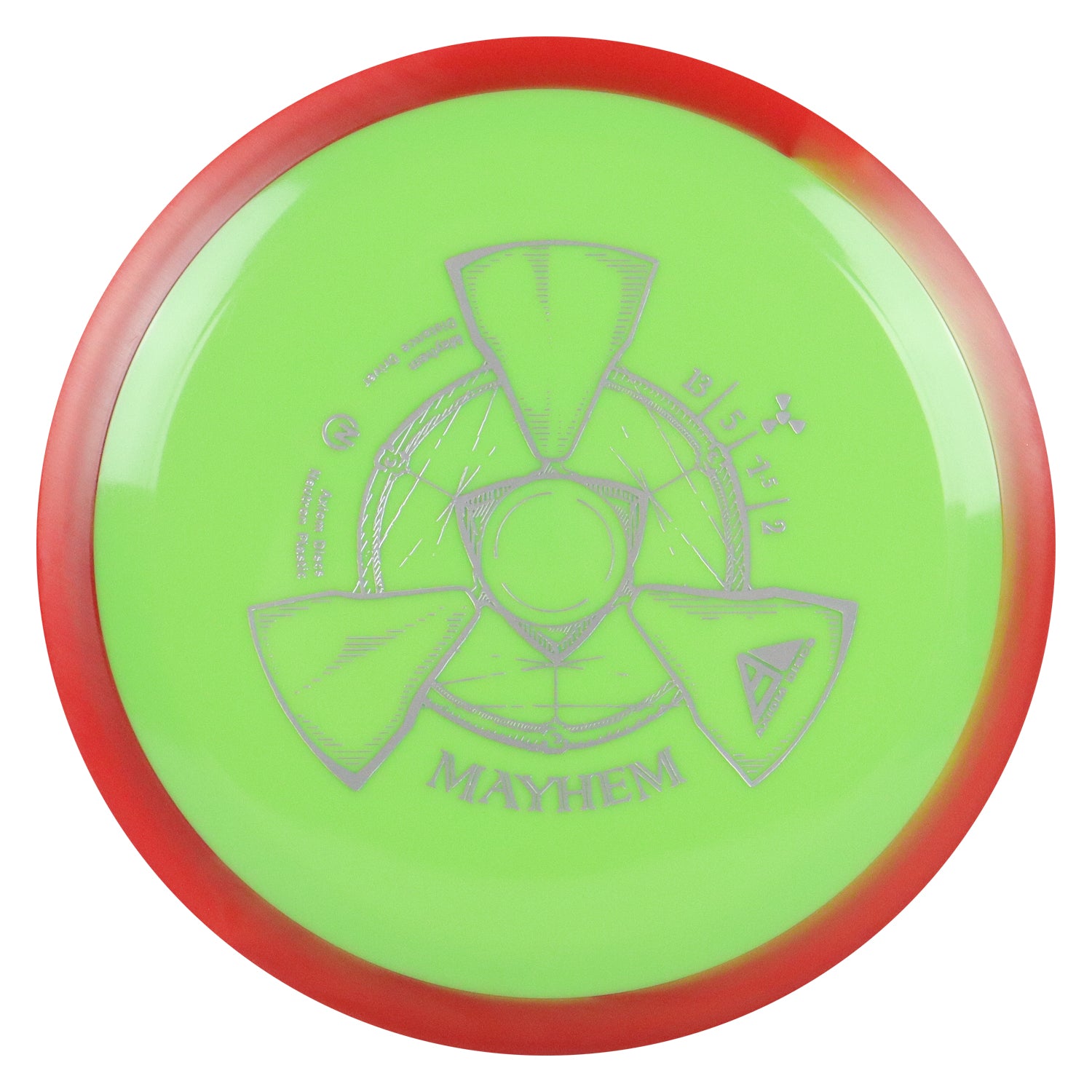 Mayhem has a responsive straight-stable profile and plenty of speed, making it a perfect workhorse driver for many advanced and expert throwers. Like the MVP 23mm class, the Mayhem has a pronounced dome to promote distance-covering glide. Mayhem is best compared to a beat MVP Octane.