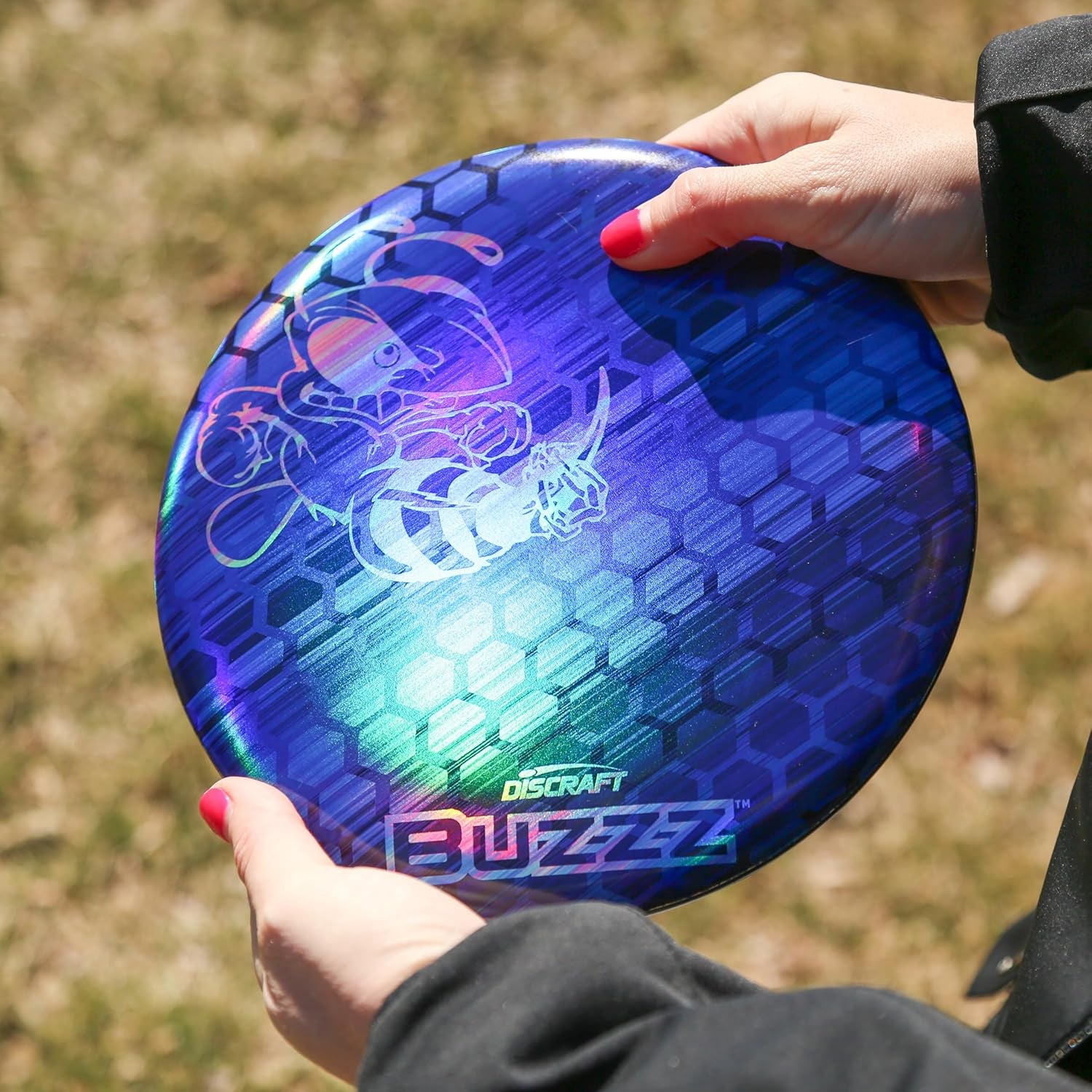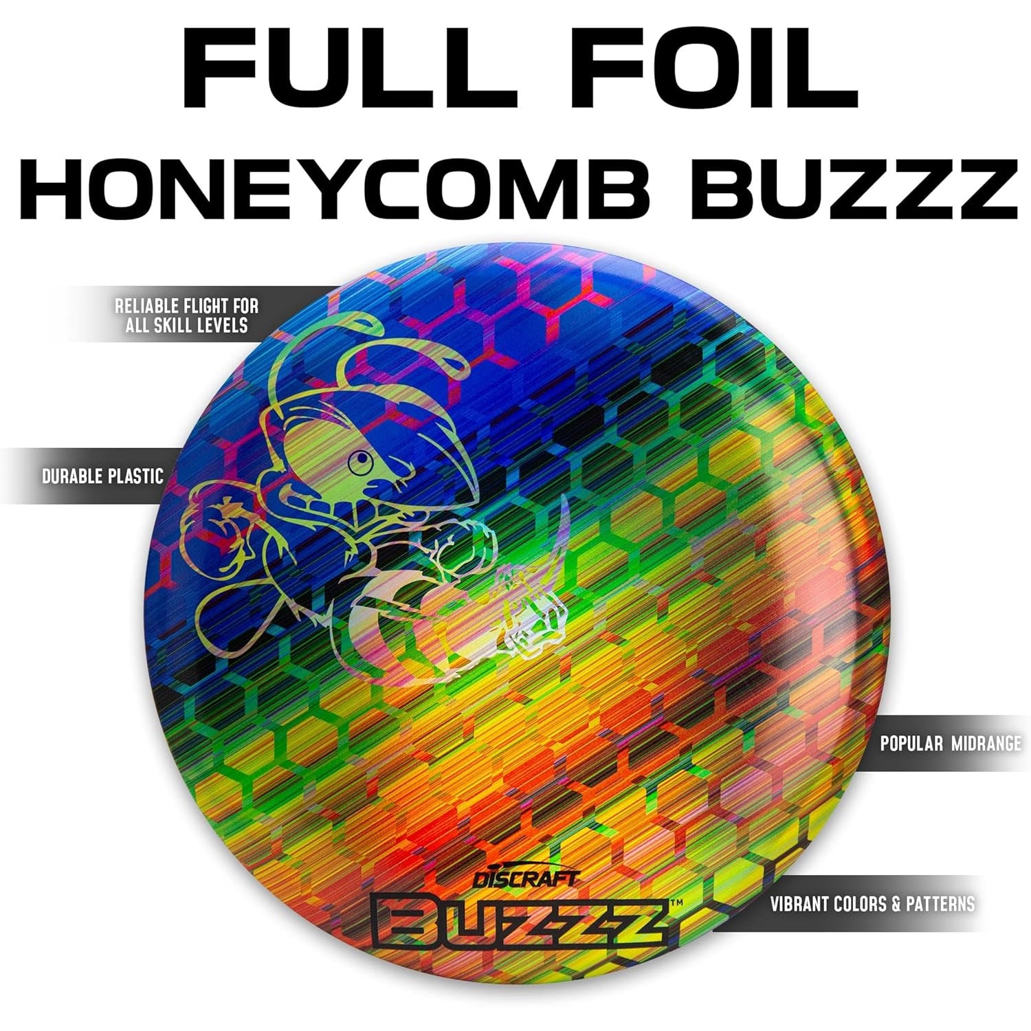 Get ready to be swarmed! This special edition Buzzz features Discraft’s vibrant Full Foil SuperColor process and showcases a buzzing hive of Buzzz bee characters covering the entire flight plate. With brilliant foil overlays and detailed artwork that captures the energy of the sport’s most trusted midrange, this release is both a visual spectacle and a reliable performer on the course. Whether you're collecting or throwing, this Full Foil SuperColor Swarm Buzzz delivers the sting in style.