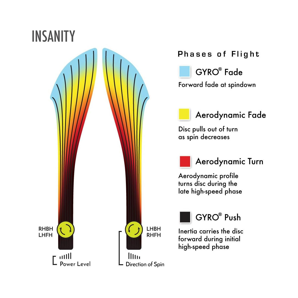 The Insanity is best described as a worn-in MVP Inertia, with a slightly more high-speed turn and a diminished fade. For average power throwers, the Insanity will be remarkably straight, while high power throwers can execute precise flip and turnover lines with ease. Whether you’re looking for that sweet-spot worn disc flight, or you’re looking to achieve bigger Inertia lines with less power, give Insanity a shot.