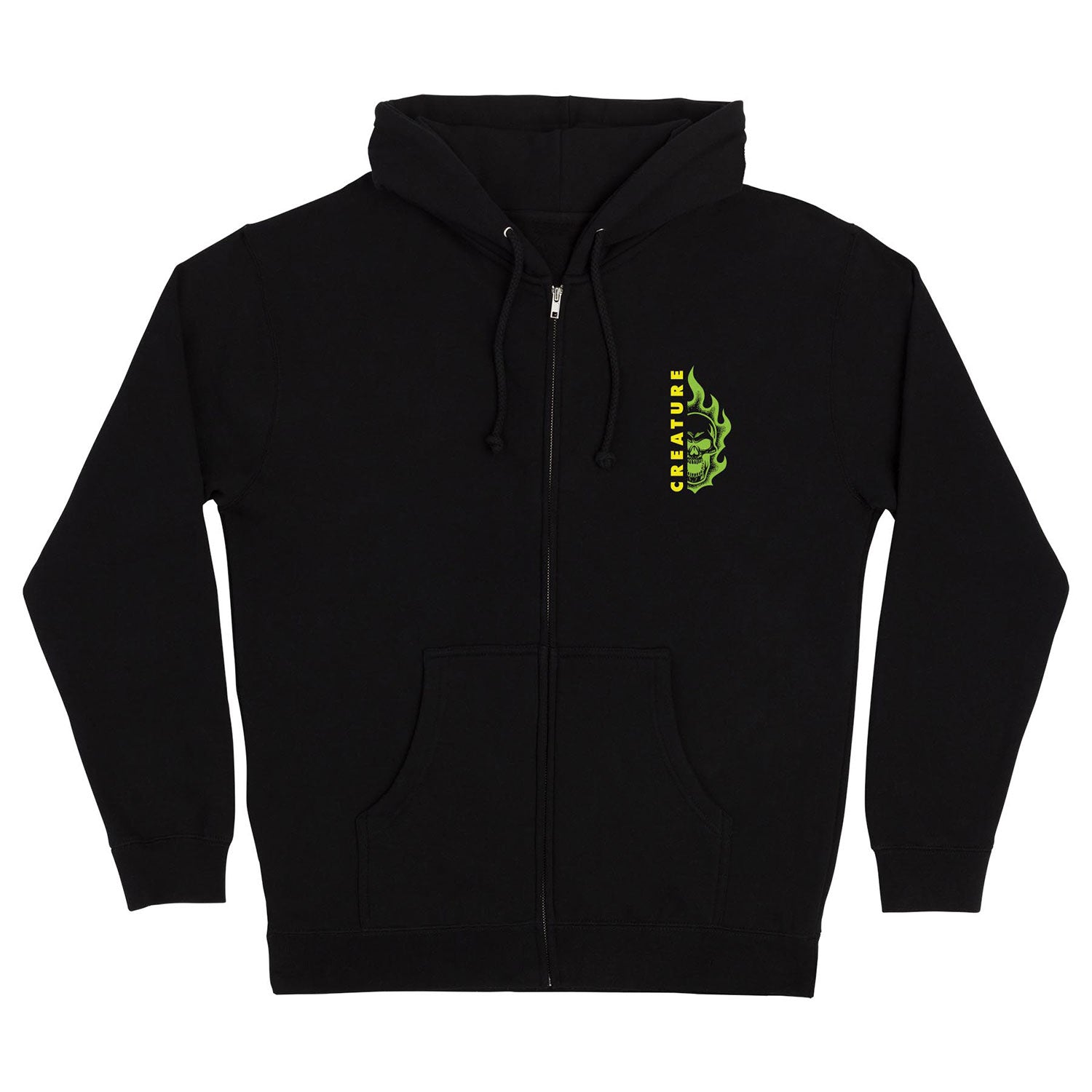 Support the horde and stay warm in the latest sweatshirts and hoodies and from Creature Skateboards. The Creature Vortex men's heavyweight fleece zip hooded sweatshirt features small front and large back Creature Vortex artwork printed in soft hand ink. Fabric weight and thickness may vary by color.