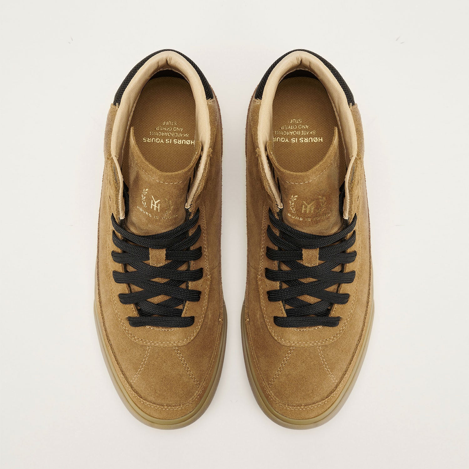The North is a new high top design with details to showcase attention to detail and design style for years to come. Made of premium suede and pigskin lining with heavy grade nylon back strip incorporated with a full overlay wrap around, glued and triple stitched for maximum wearability. This is their first shoe with a monogram gold foil logo bringing an elevated look to high top skate shoes. Goddess insoles for extra jump comfort.