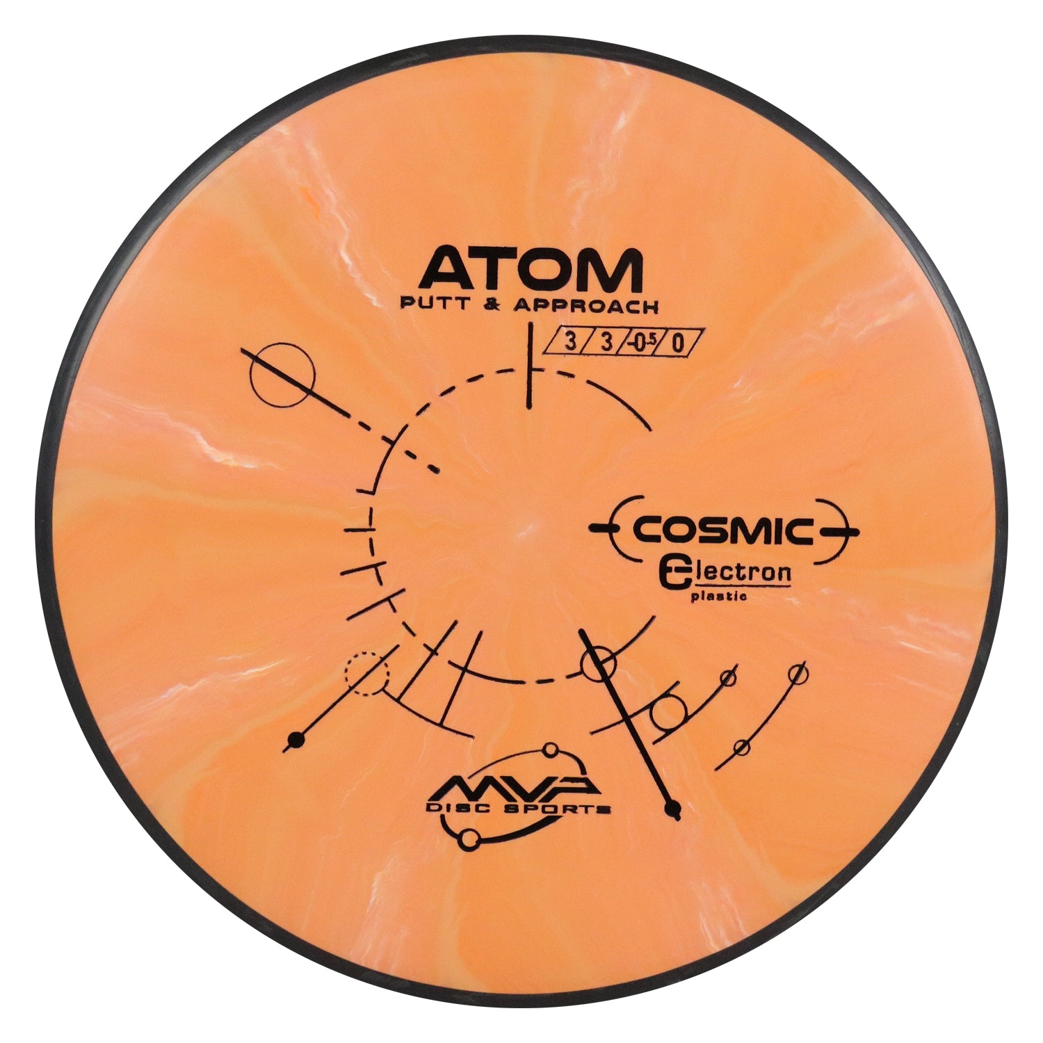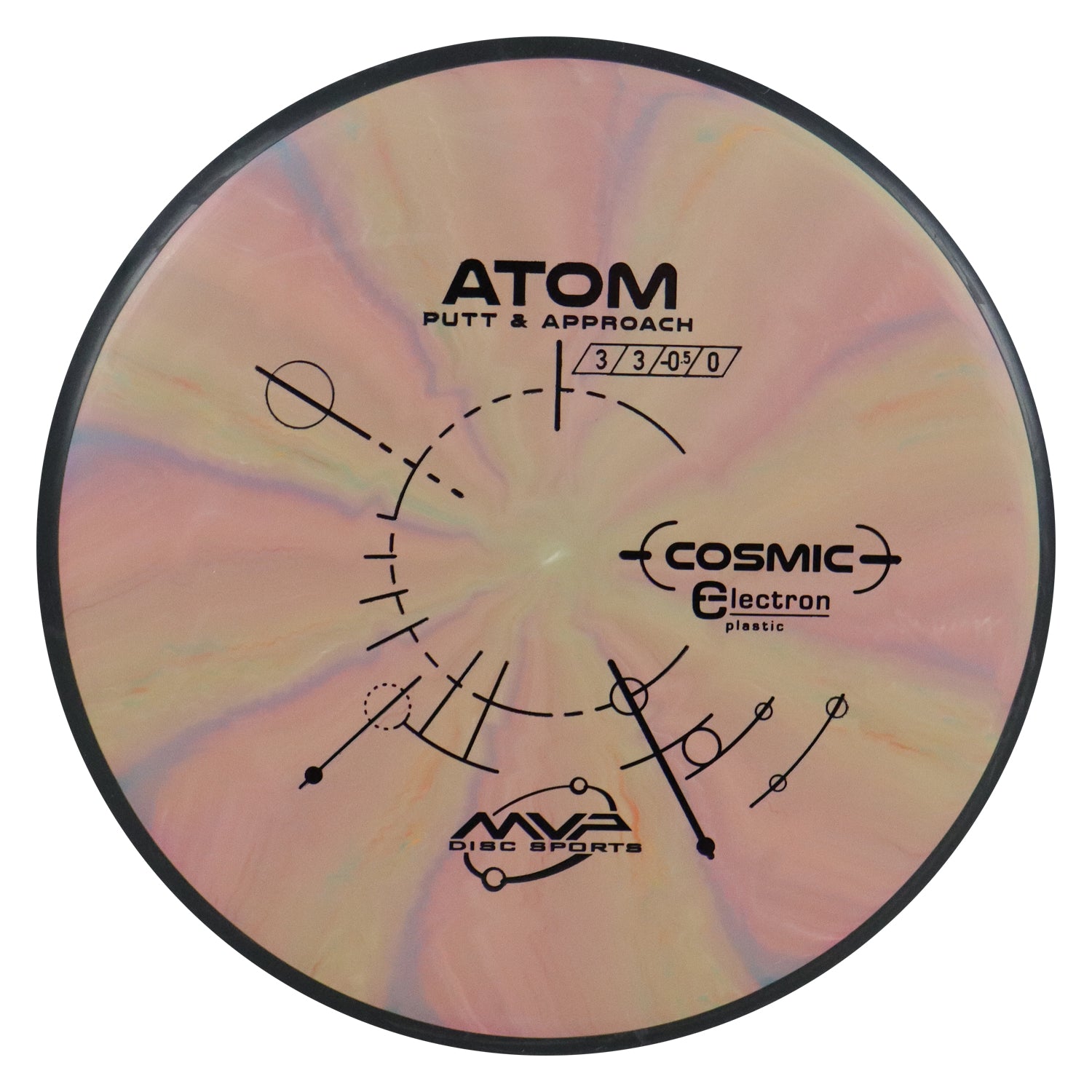 The Atom is a straight-stable putt and approach disc. The Atom is a straight flyer with enormous potential off the tee and on long approaches. Right off the shelf, the Atom has a neutral stability with just a bit of fade. In premium GYRO® plastics the Atom will retain its neutral stability indefinitely. In Electron baseline plastic the Atom will wear into an extremely straight and floaty putter, with extra tactile feedback inside the circle or in adverse weather. Premium color enhanced Electron blend. Plethora of bright color swirls. We strove to reinvent baseline with our innovative Electron plastic. This ultra-grippy all-weather material will wear its battle scars with pride and fly straighter with each hit. While retaining the GYRO effect for superb line-holding, the matte texture of Electron produces exceptional grip for confident putting and throwing. Although a premium disc twice-molded with precise blends can hardly be considered base, Electron is most similar to chalky baseline putter blends on the market. Electron comes in a regular, Soft, and Firm variations to help you find that perfect feel and grip you can trust.