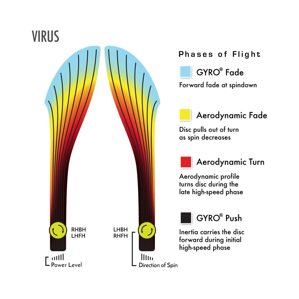 The Virus is Axiom’s easiest to throw distance driver, with a glide and responsive understability that keeps it in the air. Power throwers will be able to flex huge turnover shots with straight forward fade. Average throwers will be able to extend and shape lines using the Virus’ turn and gentle fade. Compared to the MVP lineup, the Virus resembles a worn-in Impulse.