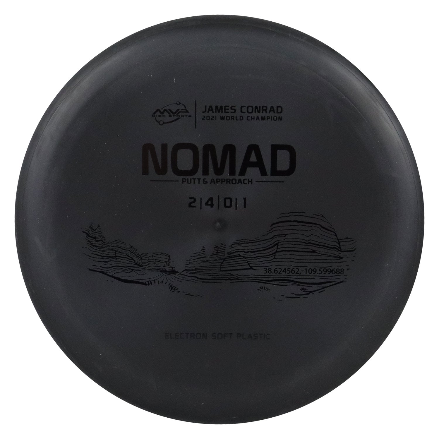 Designed by the World Champion himself - the Nomad has everything James Conrad desires in a putter. From the depth and shoulder height, all the way down to the size of the small bead - the Electron Nomad is James’ vision of an ideal putter. One of the fun challenges of designing the James Conrad Line was figuring out just what that concept meant to James and MVP. After sitting down with James and talking about his passions, it became clear that the concept of travel and exploration was going to be the bedrock of the James Conrad Line. With that in mind, James wanted to use his Line to showcase some of his favorite places and experiences on Earth. As luck would have it, months before he would go on to win the World Championships in Utah, Arches National Park was chosen as our Nomad concept —James Conrad definitely has some magic to him. From there, we had to formulate how to blend the unique themes of the James Conrad Line with those of the MVP brand itself. Mixing science with nature, much like Axiom’s representation of art, was definitely something we were looking forward to, and Art Director Mike Inscho was more than up to the task. For the Electron Nomad specifically, Mike’s inspiration was to represent Arches with audio-like waveforms — creating a topographical waveform of a trailhead that is close to James’ heart. With just enough nods to MVP themes so as to enhance, not overwhelm, the core concepts of the James Conrad Line, the Nomad truly represents the partnership between James and MVP. The results speak for themselves, and we can’t wait to see what Mike and James have in store for us next.