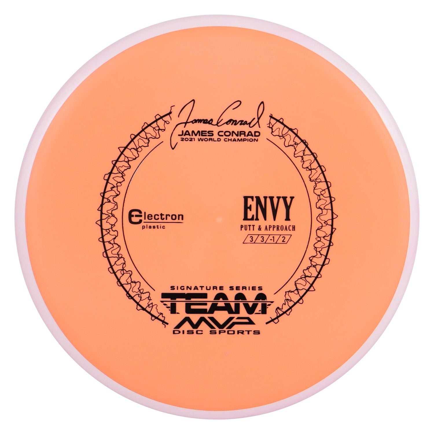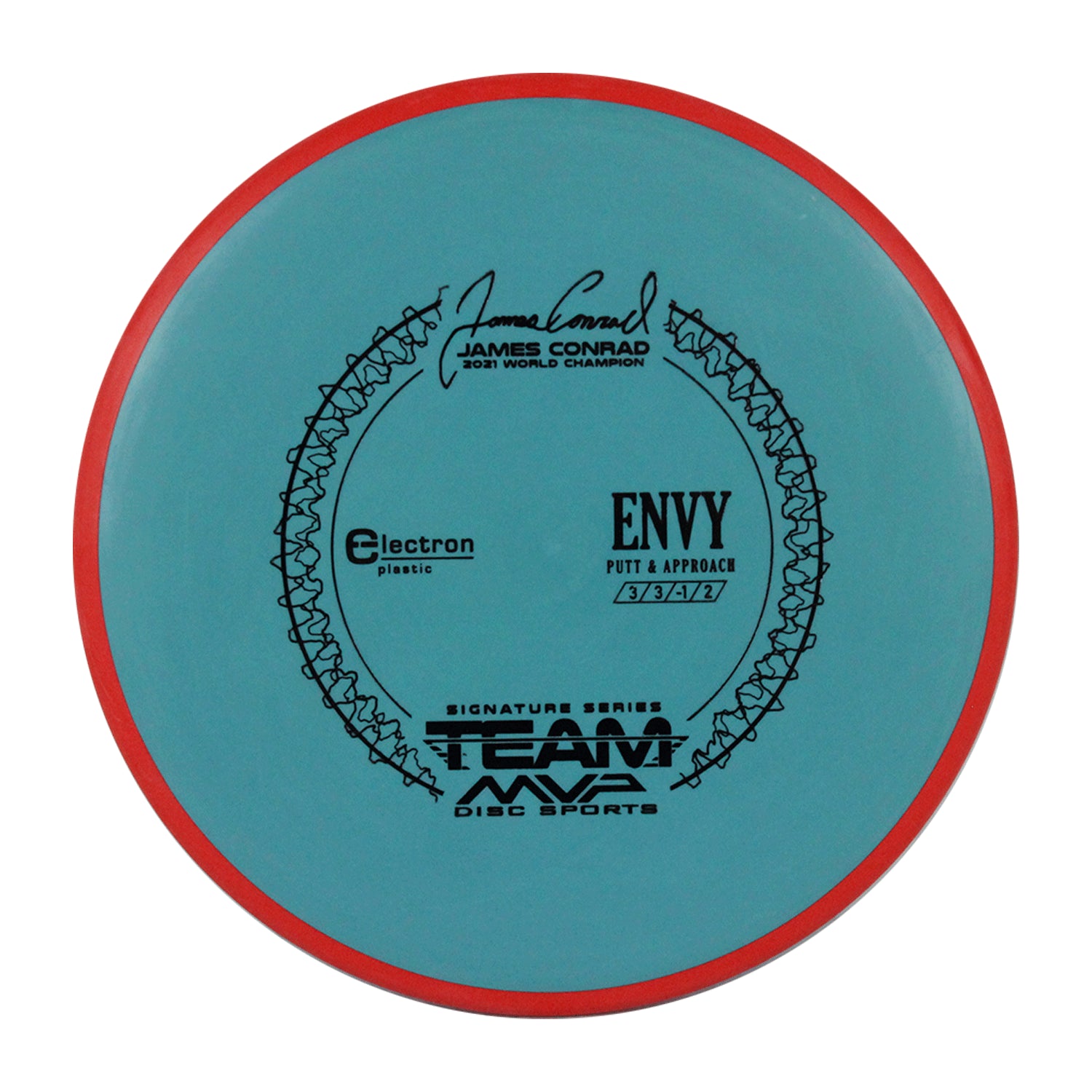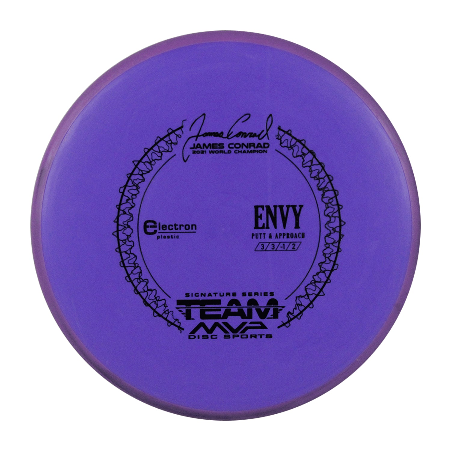 The best driving putter in disc golf is now forever linked with the best putter thrower in disc golf, and we wouldn’t have it any other way. The first James Conrad Signature Series disc, the Envy in Electron plastic, provides the grip and confidence needed for greatness. The Envy has a smooth modern feel that fits in the hand perfectly, lending confidence for both putt and approach duties. The Envy exhibits reliable high-speed stability and a minimal fade. With a slightly lower profile and cruising speed than the Ion and Anode class, the Envy is a uniquely “lid-like” stable putter.