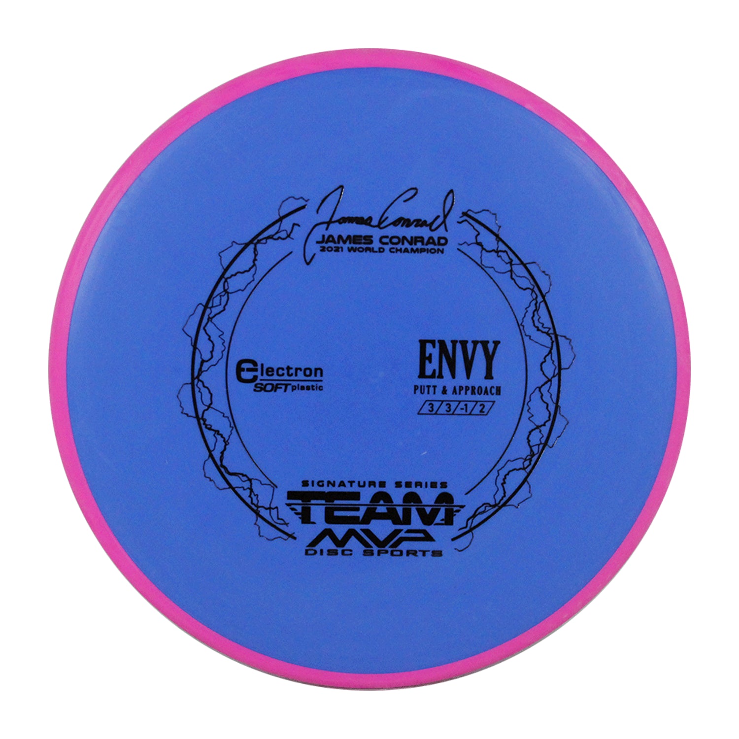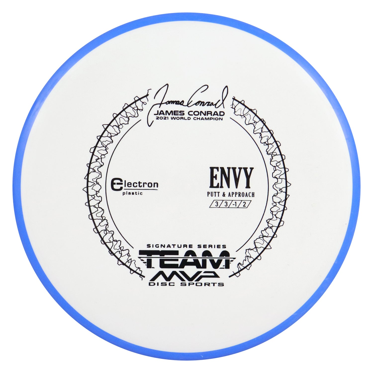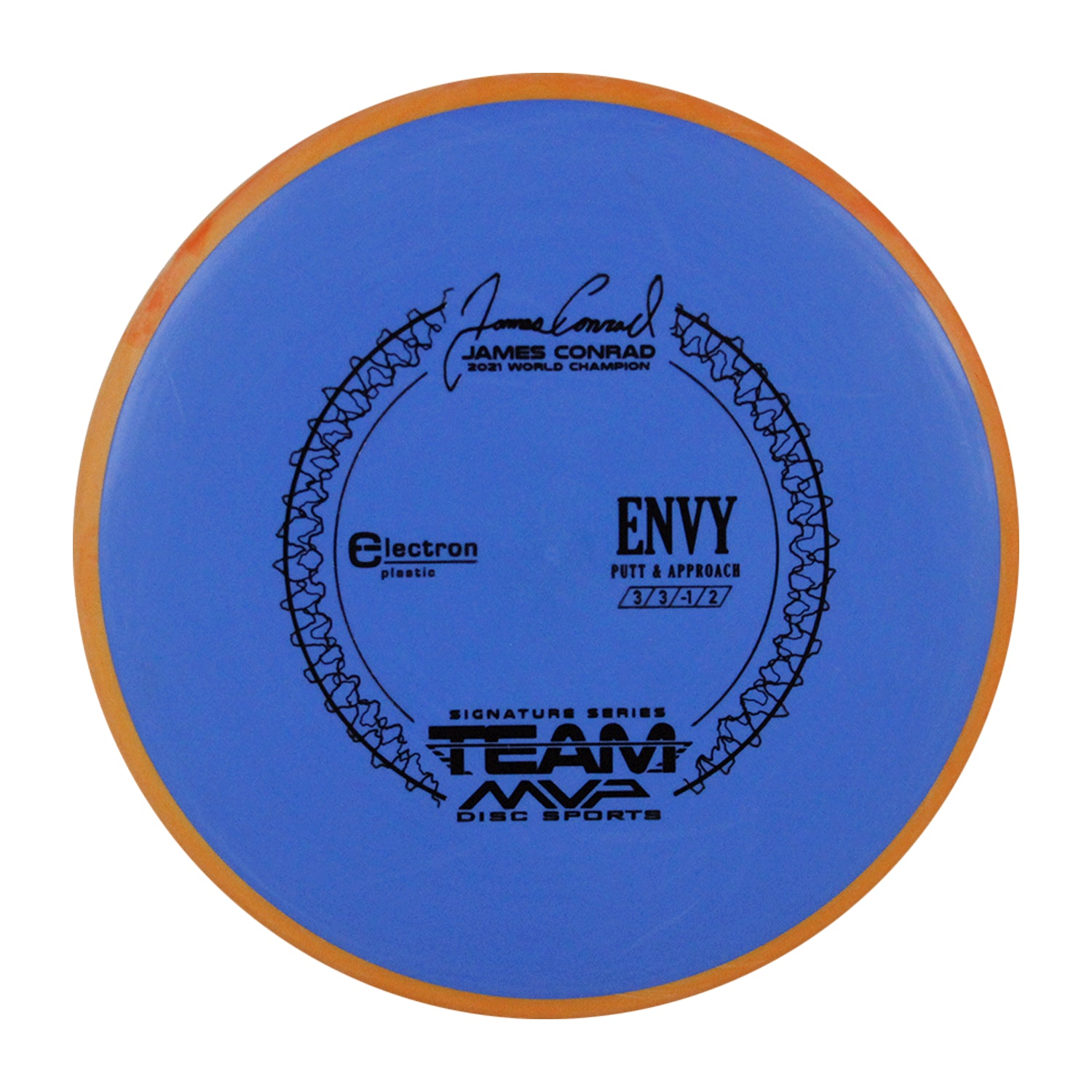 The best driving putter in disc golf is now forever linked with the best putter thrower in disc golf, and we wouldn’t have it any other way. The first James Conrad Signature Series disc, the Envy in Electron plastic, provides the grip and confidence needed for greatness. The Envy has a smooth modern feel that fits in the hand perfectly, lending confidence for both putt and approach duties. The Envy exhibits reliable high-speed stability and a minimal fade. With a slightly lower profile and cruising speed than the Ion and Anode class, the Envy is a uniquely “lid-like” stable putter.