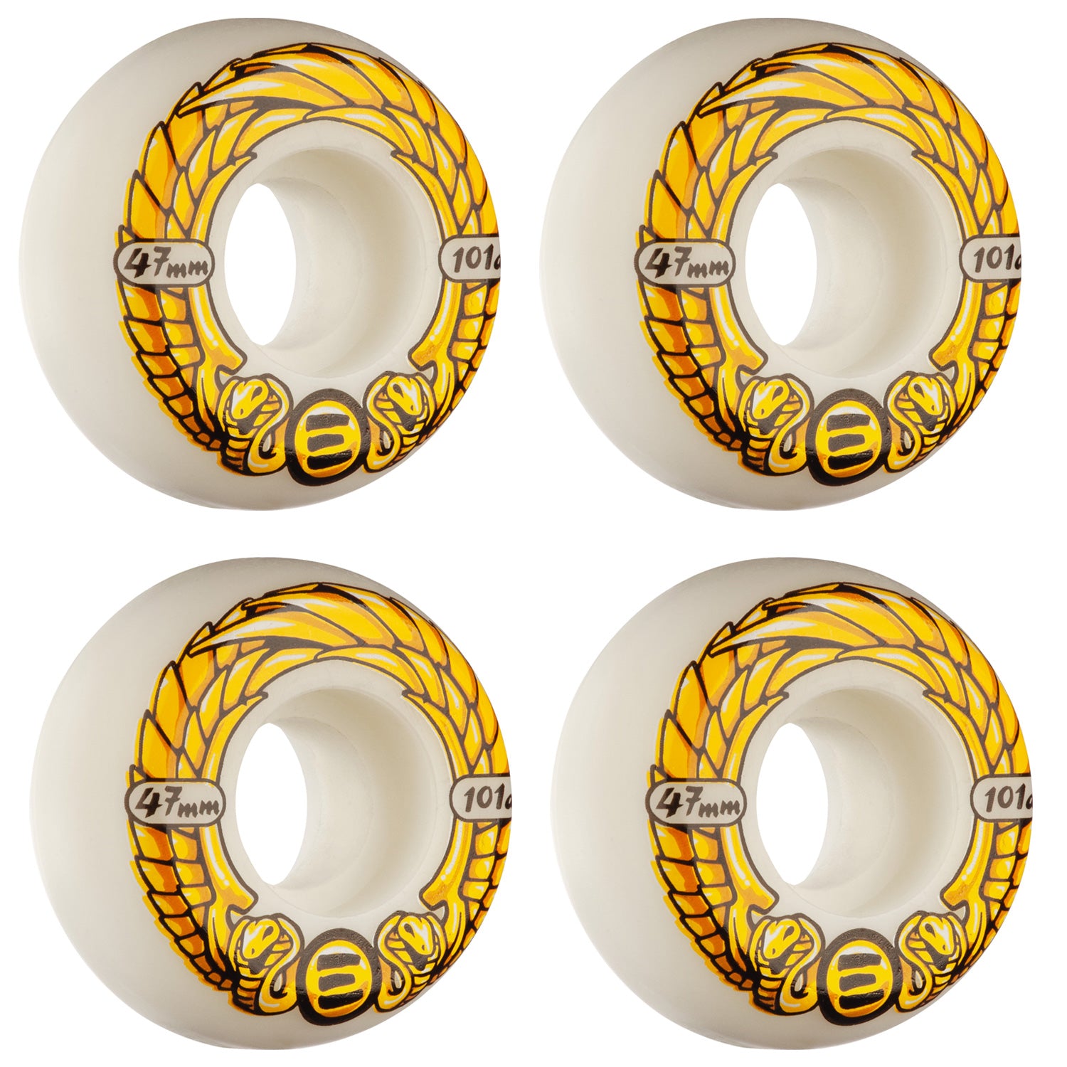 4-Pack of Aggressive Inline wheels from Eulogy. 100% USA Made in Santa Barbara California. Eulogy Wheels has re-released their throw back winged globe Egyptian style graphic. A great hard, well rounded radius anti rocker wheel. 47mm 101A 4-Pack.