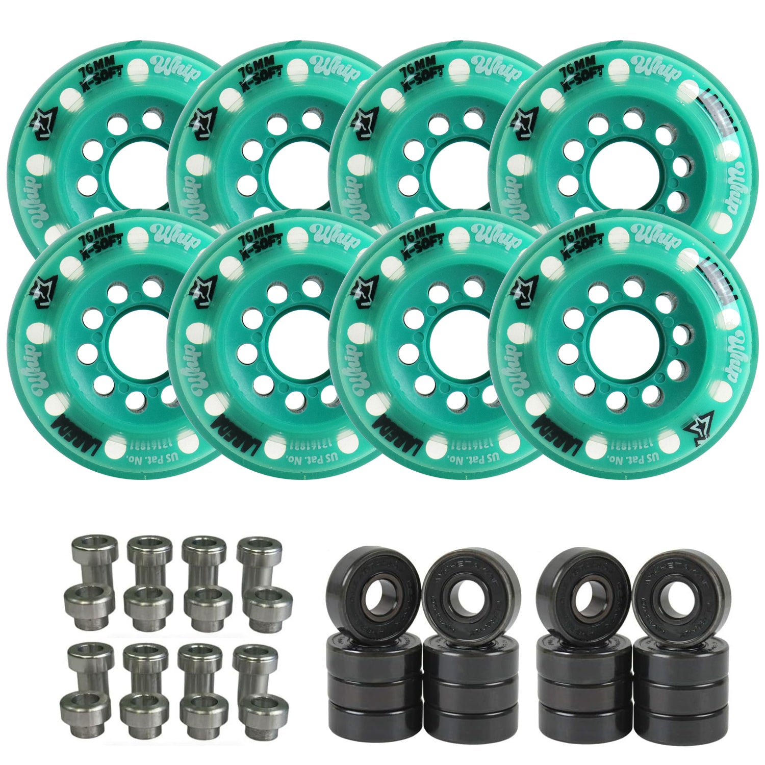 Labeda Whips Roller Hockey Wheels - Teal X-Soft 76mm - 8-Pack with Evo Spacers and Hybrid Ceramic Bearings