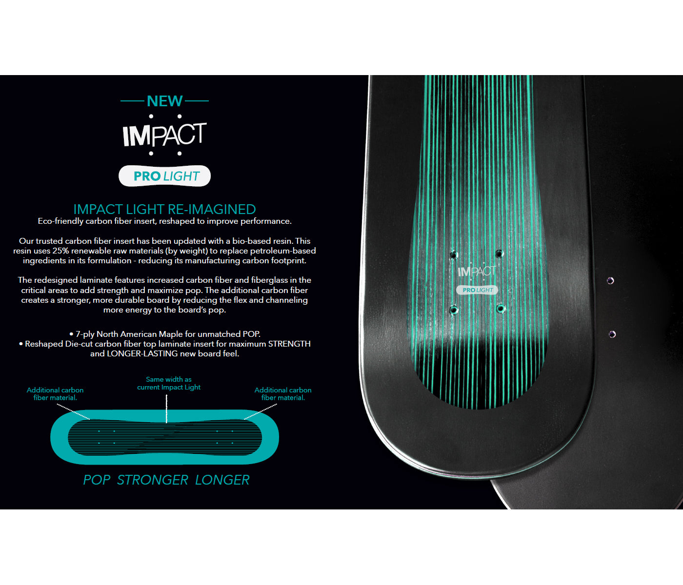 DECK: 7-Ply North American Maple with epoxy resin glue. Impact Light features a die-cut carbon fiber top laminate insert. This creates the lightest deck on the market. Stronger, longer lasting pop, and longer deck life compared to the industry standard. This board measures 8.0" x 31.6" with a 14" wheelbase and full concave.