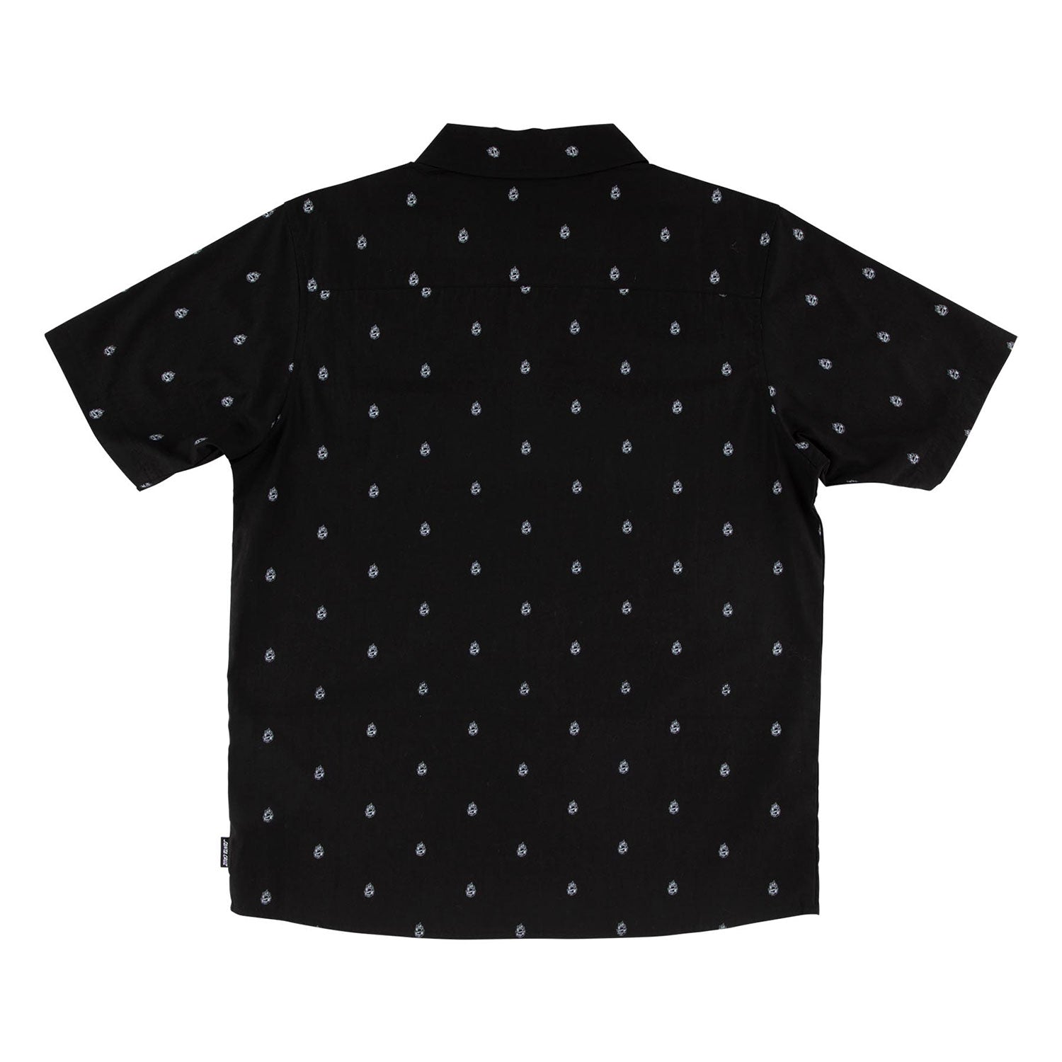 The Santa Cruz Screaming Fire men custom regular fit short-sleeve button up shirt features Screaming Fire all over print, chest patch pockets with button closure, button front closure, stand collar, front embroidery pocket logo, and side seam woven logo label.