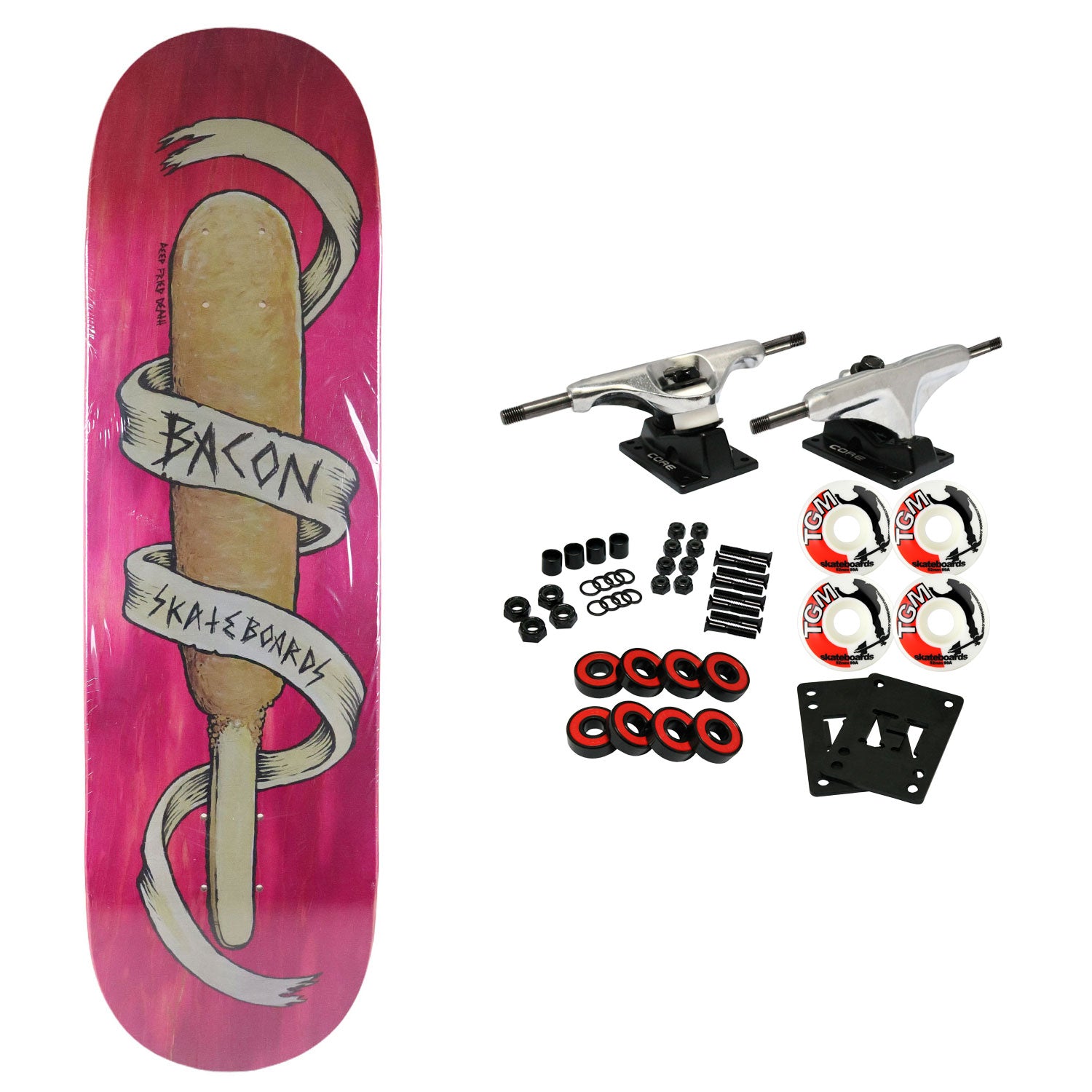 Bacon Skateboards are made with Premium 7-Ply North American Maple. This board measures 8.6" x 32.63" with a 14.5" wheelbase. Comes with Core trucks, 52mm TGM logo wheels, Amp abec 5 bearings, Black Diamond Griptape, risers, and hardware. Core trucks are light weight and feature heavy duty aluminum with grade 8 steel kingpins and axles, as well as USA made bushings and pivot cups. 52mm 99A are the perfect wheels for both street and park skating. Like the name states, Amp bearings are stimulants for your wheels! Light synthetic oil, Delrin Crowns, and Rubber Serviceable Shields are a few of the things that makes these bearings one of the best Abec 5 rated bearings on the market. Arrives un-assembled which allows for customization and a feeling of accomplishment. Skaters love building their boards! Easy to assemble!