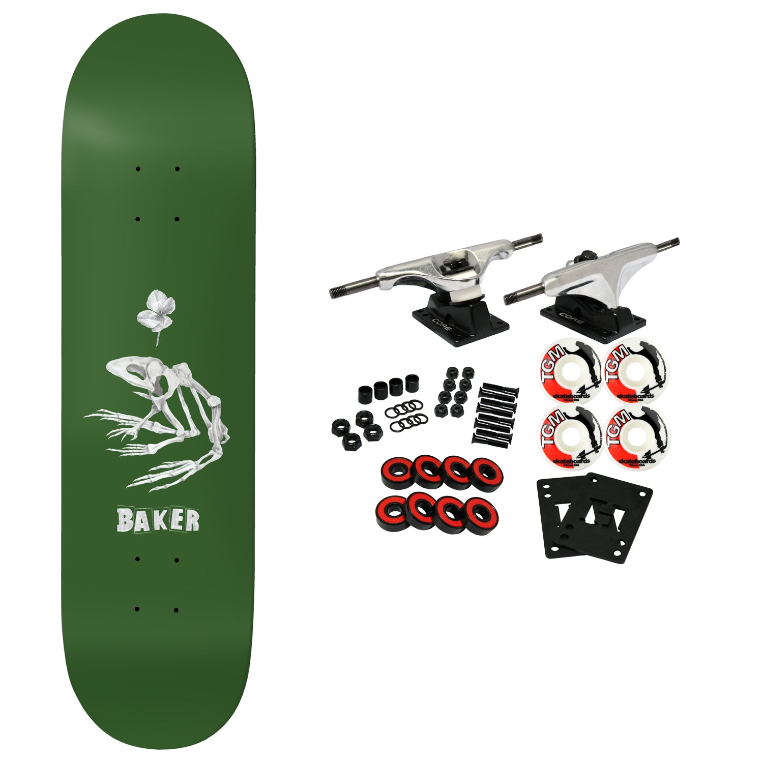 The Baker B2 shape features a squared nose and tail for more board feel. Constructed with 7-Ply North American Maple. Steep Concave. Measures 8.38" x 32" with a 14.5" wheelbase. Assorted Top Stains. Comes with Core trucks, 52mm TGM logo wheels, Amp abec 5 bearings, Black Diamond Griptape, risers, and hardware. Core trucks are light weight and feature heavy duty aluminum with grade 8 steel kingpins and axles, as well as USA made bushings and pivot cups. 52mm 99A are the perfect wheels for both street and park skating. Like the name states, Amp bearings are stimulants for your wheels! Light synthetic oil, Delrin Crowns, and Rubber Serviceable Shields are a few of the things that makes these bearings one of the best Abec 5 rated bearings on the market. Arrives un-assembled which allows for customization and a feeling of accomplishment. Skaters love building their boards! Easy to assemble!