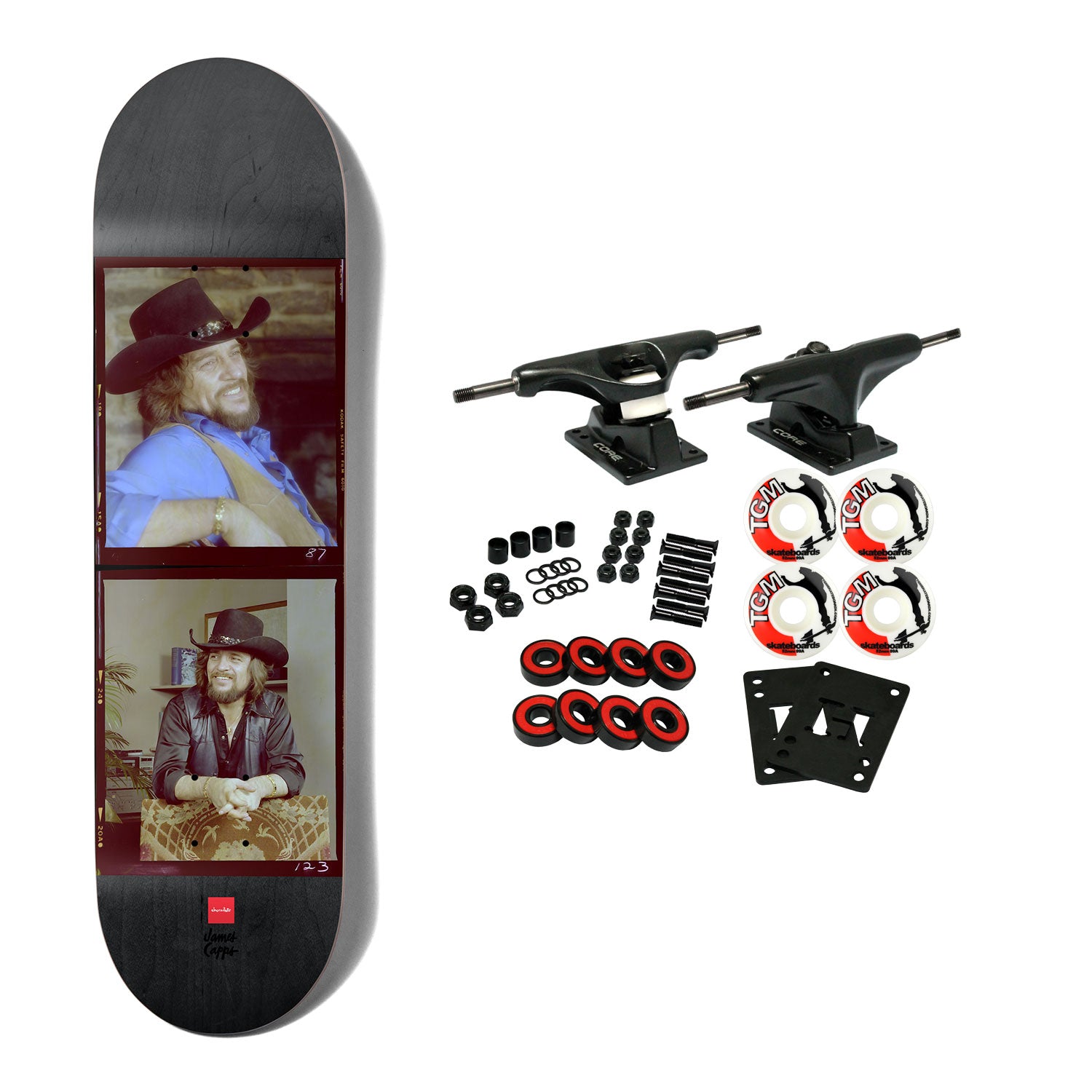 The G039 Shape. Full nose, slightly tapered, rail to tail. Constructed with 7-Ply North American Maple. Measures 8.5" x 31.75" with a 14.25" wheelbase. Comes with Core trucks, 52mm TGM logo wheels, Amp abec 5 bearings, Black Diamond Griptape, risers, and hardware. Core trucks are light weight and feature heavy duty aluminum with grade 8 steel kingpins and axles, as well as USA made bushings and pivot cups. 52mm 99A are the perfect wheels for both street and park skating. Like the name states, Amp bearings are stimulants for your wheels! Light synthetic oil, Delrin Crowns, and Rubber Serviceable Shields are a few of the things that makes these bearings one of the best Abec 5 rated bearings on the market. Arrives un-assembled which allows for customization and a feeling of accomplishment. Skaters love building their boards! Easy to assemble!