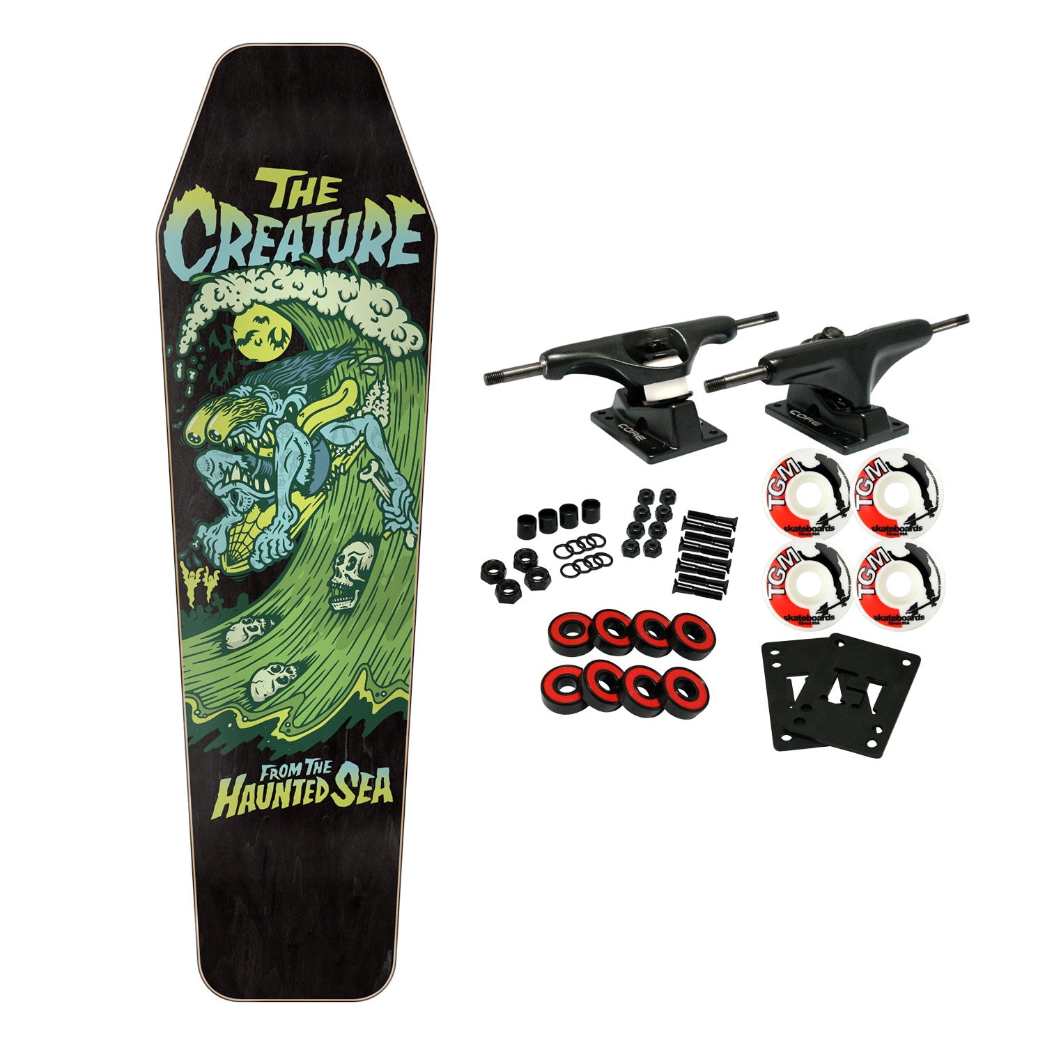 Surfs up, Brah.. The Creature from the Haunted Sea is calling. Paddle out to your favorite alley break or black top bank on this agile 8.48" Coffin shape and rip it. Comes with Core trucks, 52mm TGM logo wheels, Amp abec 5 bearings, Black Diamond Griptape, risers, and hardware. Core trucks are light weight and feature heavy duty aluminum with grade 8 steel kingpins and axles, as well as USA made bushings and pivot cups. 52mm 99A are the perfect wheels for both street and park skating. Like the name states, Amp bearings are stimulants for your wheels! Light synthetic oil, Delrin Crowns, and Rubber Serviceable Shields are a few of the things that makes these bearings one of the best Abec 5 rated bearings on the market. Arrives un-assembled which allows for customization and a feeling of accomplishment. Skaters love building their boards! Easy to assemble!