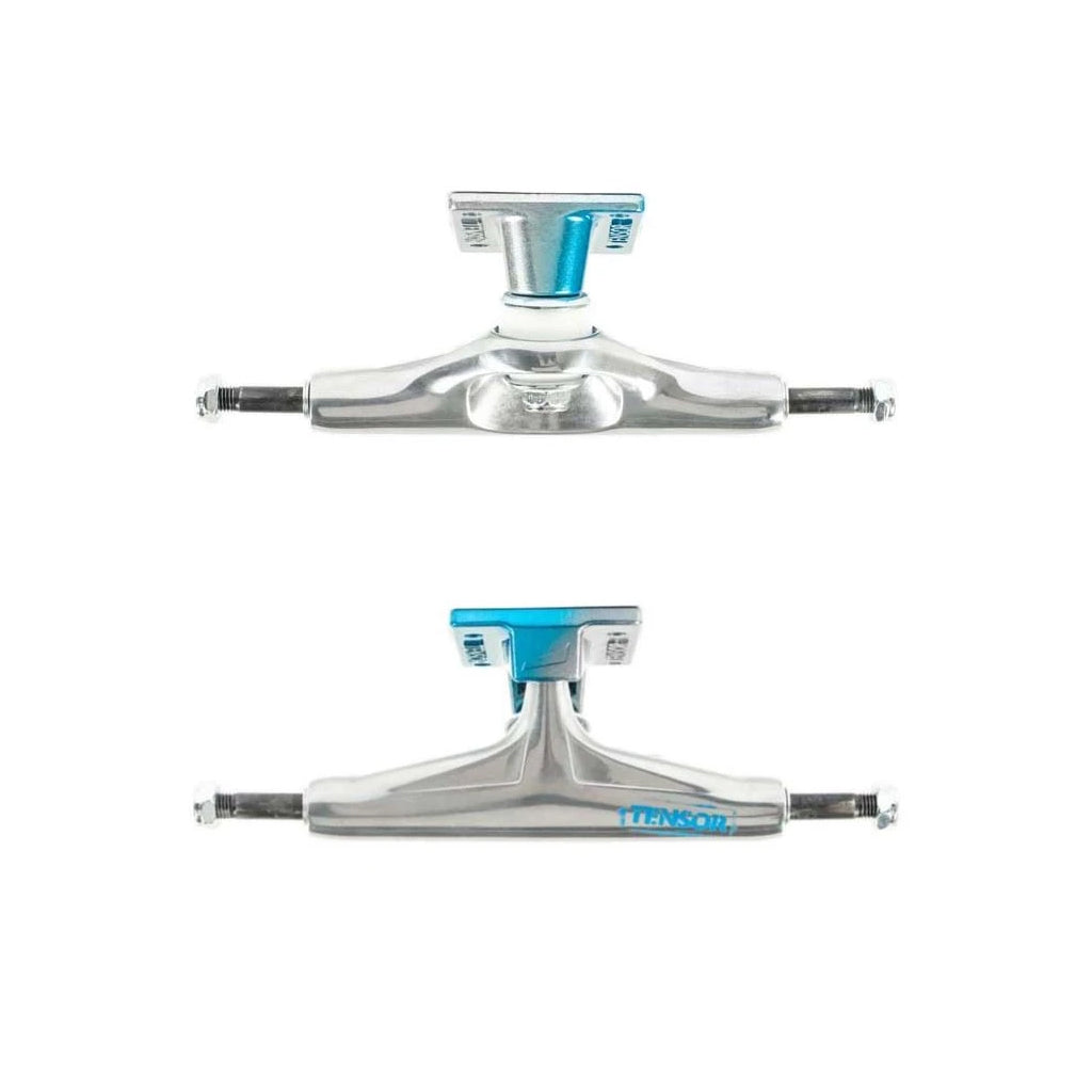TRUCKS: Tensor Aluminum. Best Grind. Best Turn. Best Truck. Raw Grind. Fast Turn. Traditional Aluminum Alloy. Tensor uses the finest metals and manufacturing processes to produce the best quality skateboard truck on the market. Tensor 5.5 trucks measure 8.25" wide. Includes 2 trucks.