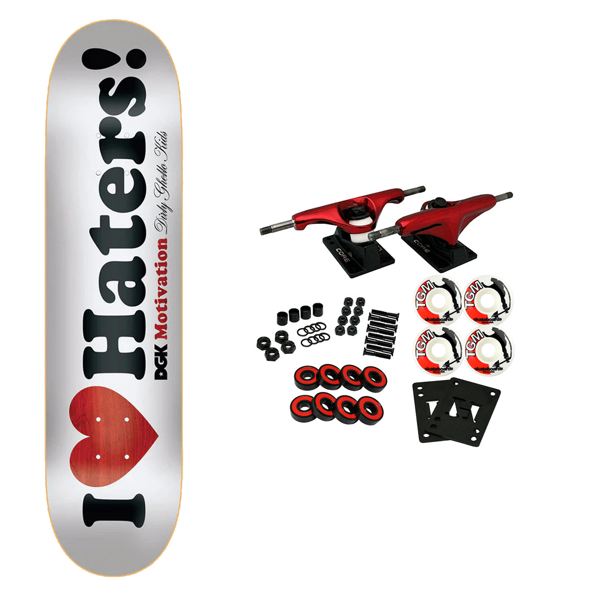 Comes with Core trucks, 52mm TGM logo wheels, Amp abec 5 bearings, Black Diamond Griptape, risers, and hardware. Core trucks are light weight and feature heavy duty aluminum with grade 8 steel kingpins and axles, as well as USA made bushings and pivot cups. 52mm 99A are the perfect wheels for both street and park skating. Like the name states, Amp bearings are stimulants for your wheels! Light synthetic oil, Delrin Crowns, and Rubber Serviceable Shields are a few of the things that makes these bearings one of the best Abec 5 rated bearings on the market. Arrives un-assembled which allows for customization and a feeling of accomplishment. Skaters love building their boards! Easy to assemble!