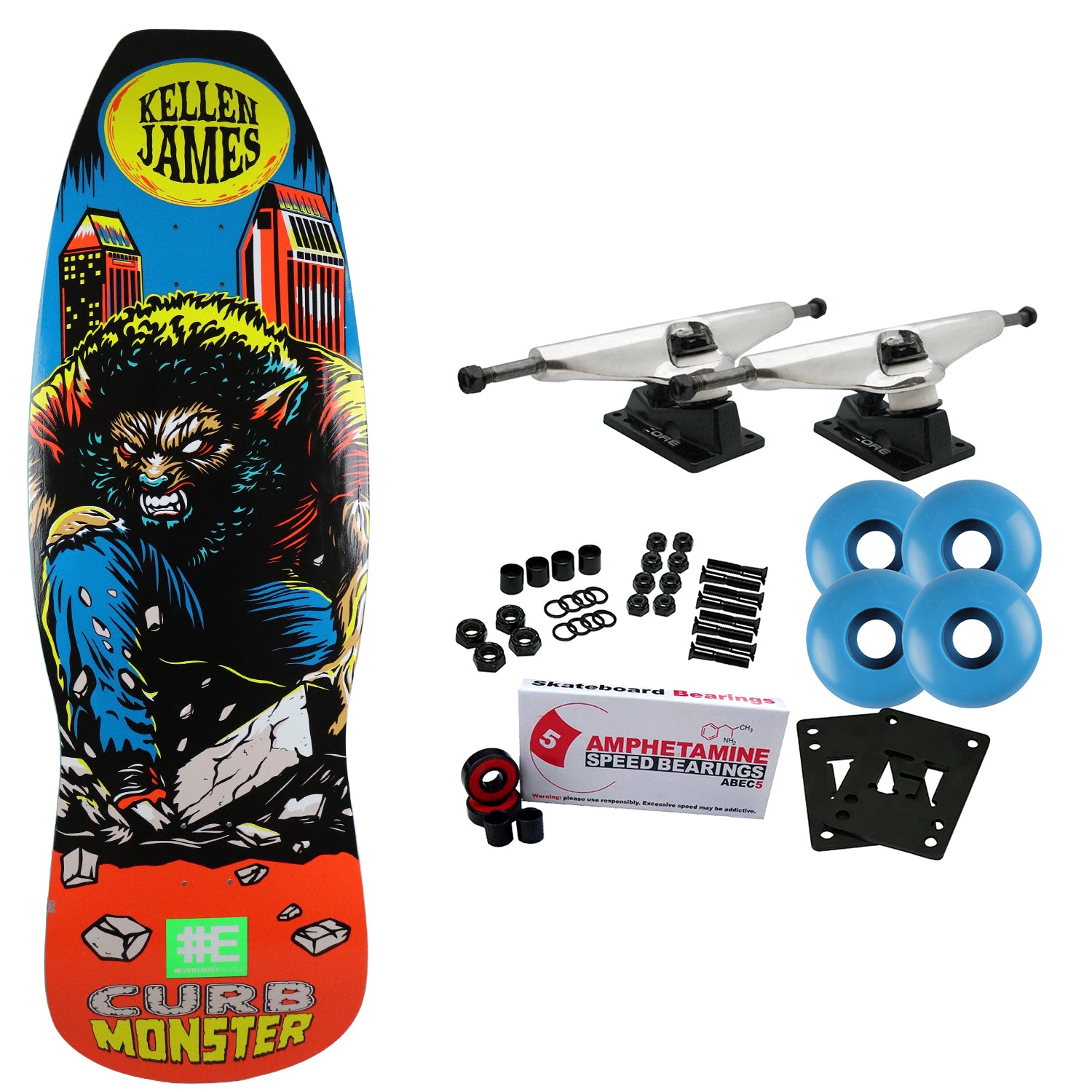 Kellen James signature guest board from the Curb Monster series. Everybody Skates Standard Shaped Decks are constructed with Premium, 7-Ply North American Maple. This board measures 9.75" x 33" with a 14.75" wheelbase. Comes with Core trucks, 58mm 97A wheels, Amp abec 5 bearings, Black Diamond Griptape, risers, and hardware. Core trucks are light weight and feature heavy duty aluminum with grade 8 steel kingpins and axles, as well as USA made bushings and pivot cups. 58mm 97A are the perfect wheels for both street and park skating. Like the name states, Amp bearings are stimulants for your wheels! Light synthetic oil, Delrin Crowns, and Rubber Serviceable Shields are a few of the things that makes these bearings one of the best Abec 5 rated bearings on the market. Arrives un-assembled which allows for customization and a feeling of accomplishment. Skaters love building their boards! Easy to assemble!