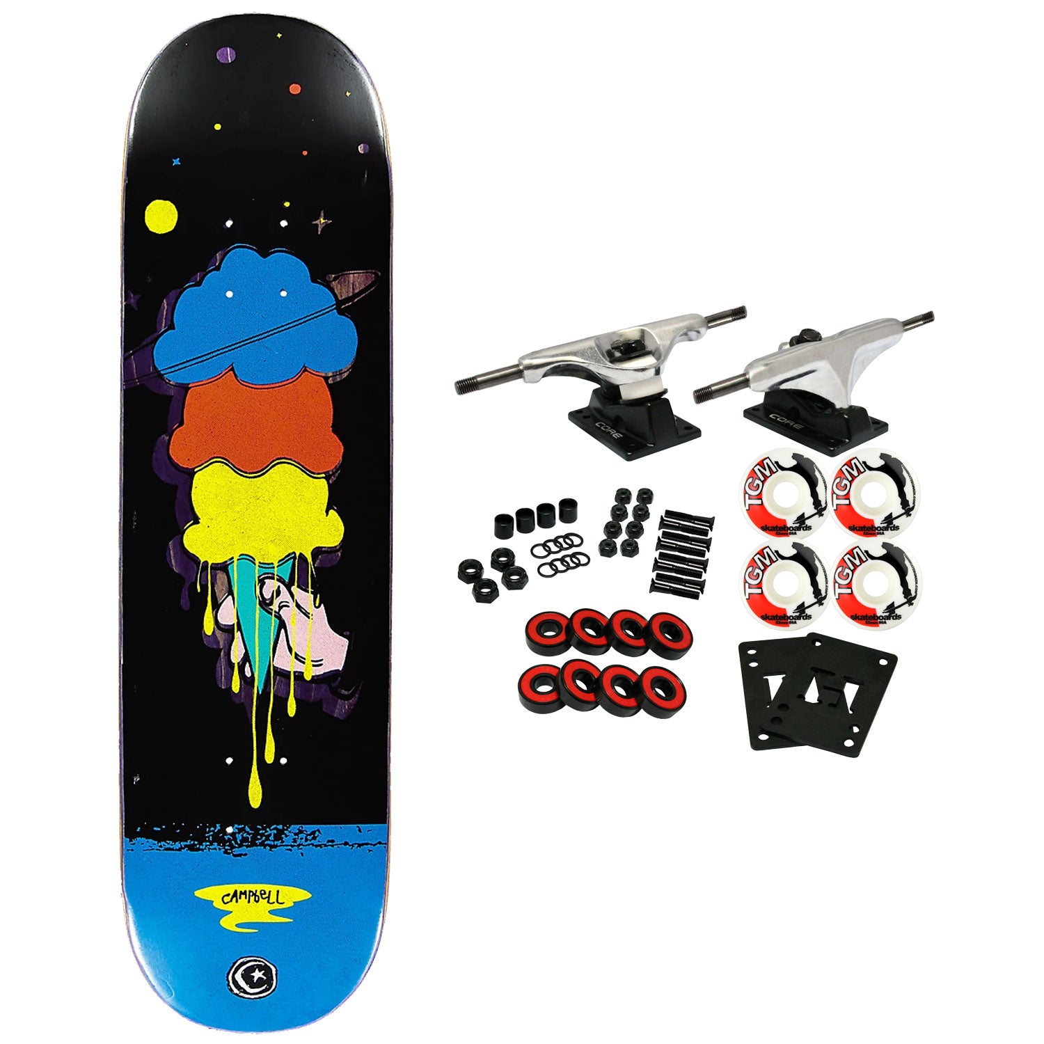 Foundation skateboard decks are constructed with 7-Ply North American Maple. This board measures 8.25" x 32" with a 14.25" wheelbase. Comes with Core trucks, 52mm TGM logo wheels, Amp abec 5 bearings, Black Diamond Griptape, risers, and hardware. Core trucks are light weight and feature heavy duty aluminum with grade 8 steel kingpins and axles, as well as USA made bushings and pivot cups. 52mm 99A are the perfect wheels for both street and park skating. Like the name states, Amp bearings are stimulants for your wheels! Light synthetic oil, Delrin Crowns, and Rubber Serviceable Shields are a few of the things that makes these bearings one of the best Abec 5 rated bearings on the market. Arrives un-assembled which allows for customization and a feeling of accomplishment. Skaters love building their boards! Easy to assemble!