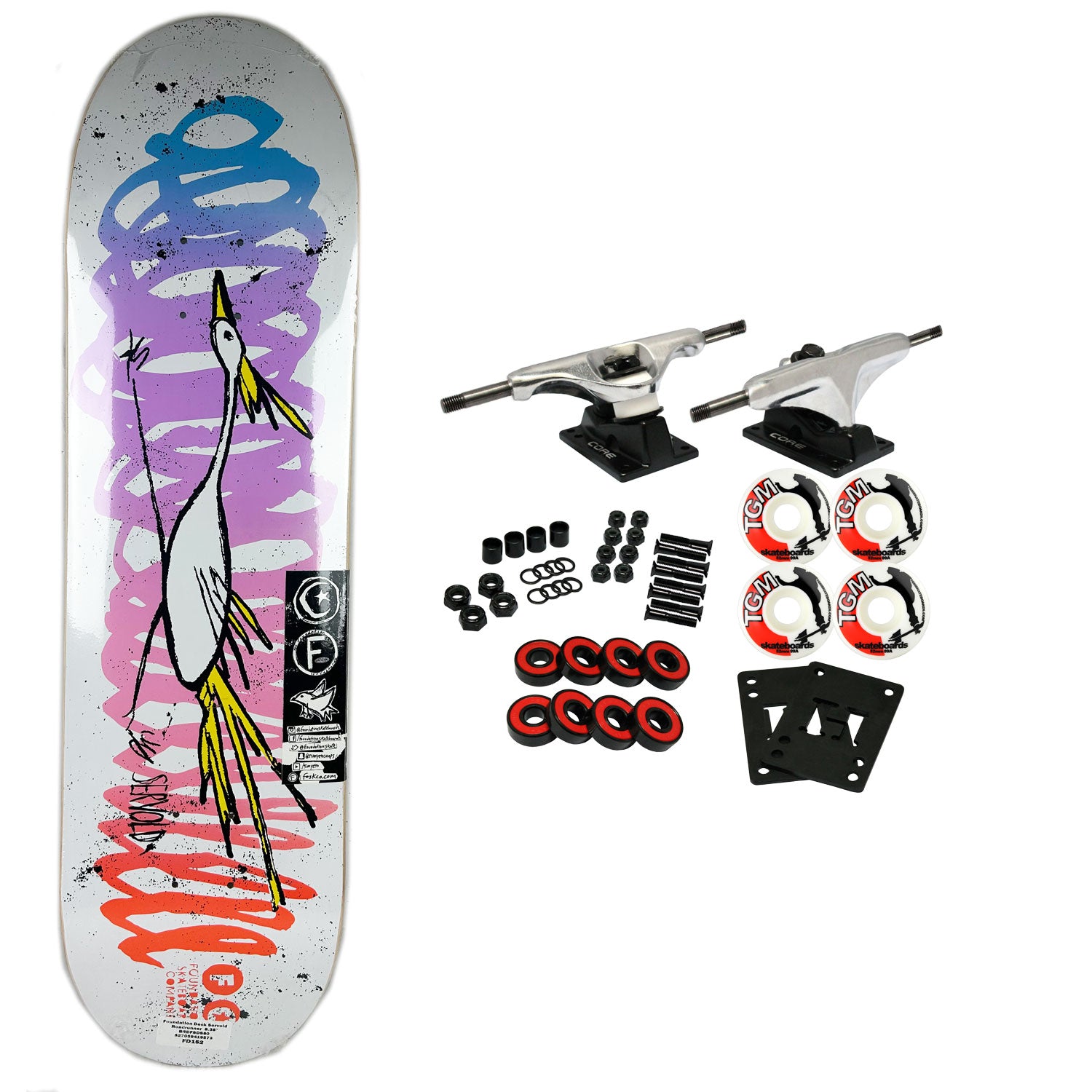 Foundation skateboard decks are constructed with 7-Ply North American Maple. This board measures 8.38" x 32.25" with a 14.5" wheelbase. Comes with Core trucks, 52mm TGM logo wheels, Amp abec 5 bearings, Black Diamond Griptape, risers, and hardware. Core trucks are light weight and feature heavy duty aluminum with grade 8 steel kingpins and axles, as well as USA made bushings and pivot cups. 52mm 99A are the perfect wheels for both street and park skating. Like the name states, Amp bearings are stimulants for your wheels! Light synthetic oil, Delrin Crowns, and Rubber Serviceable Shields are a few of the things that makes these bearings one of the best Abec 5 rated bearings on the market. Arrives un-assembled which allows for customization and a feeling of accomplishment. Skaters love building their boards! Easy to assemble!