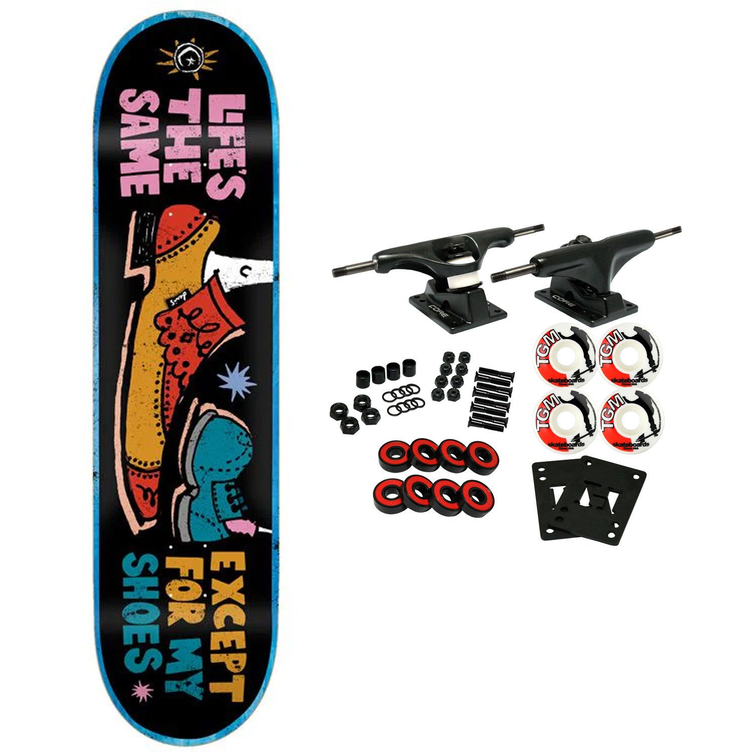 Foundation skateboard decks are constructed with 7-Ply North American Maple. This board measures 8.25" x 31.75" with a 14.5" wheelbase. Comes with Core trucks, 52mm TGM logo wheels, Amp abec 5 bearings, Black Diamond Griptape, risers, and hardware. Core trucks are light weight and feature heavy duty aluminum with grade 8 steel kingpins and axles, as well as USA made bushings and pivot cups. 52mm 99A are the perfect wheels for both street and park skating. Like the name states, Amp bearings are stimulants for your wheels! Light synthetic oil, Delrin Crowns, and Rubber Serviceable Shields are a few of the things that makes these bearings one of the best Abec 5 rated bearings on the market. Arrives un-assembled which allows for customization and a feeling of accomplishment. Skaters love building their boards! Easy to assemble!