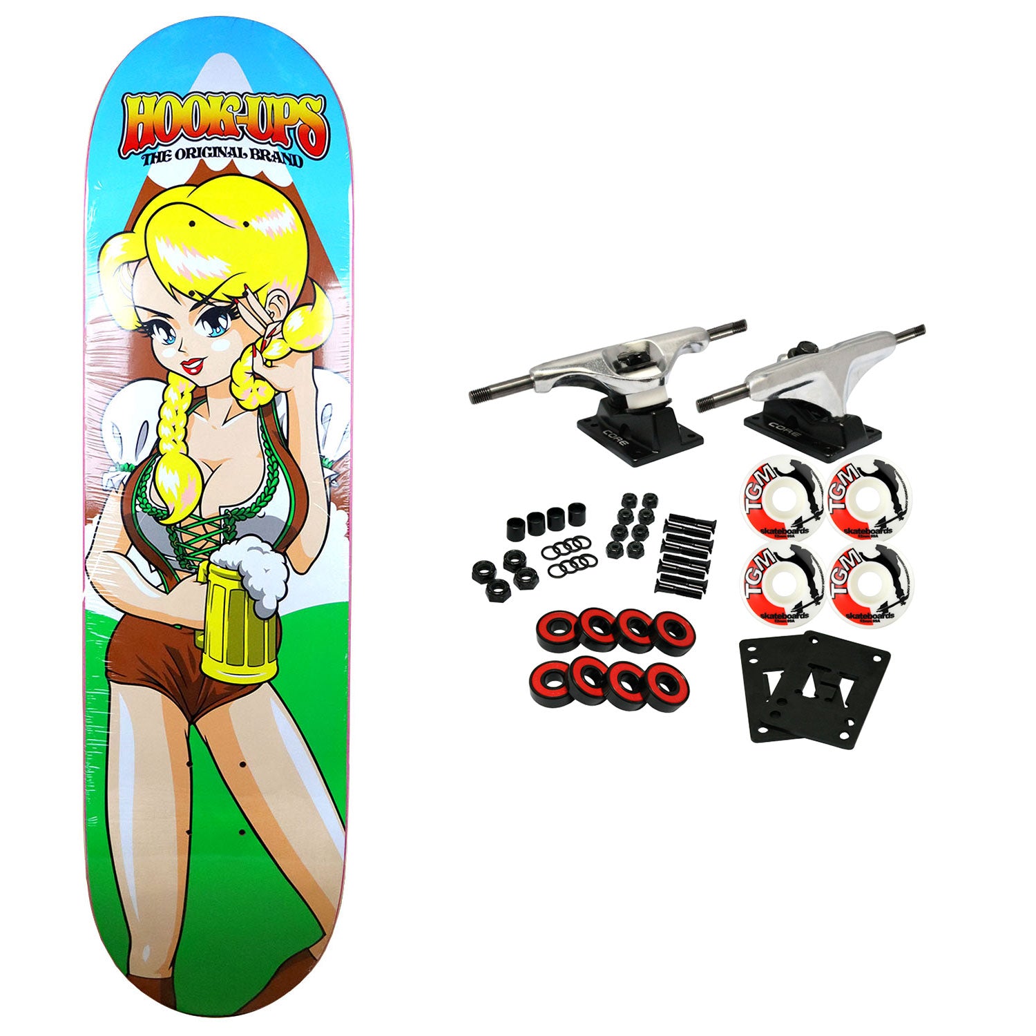 Hook Ups skateboard decks are made with premium 7-Ply North American Maple. Comes with Core trucks, 52mm TGM logo wheels, Amp abec 5 bearings, Black Diamond Griptape, risers, and hardware. Core trucks are light weight and feature heavy duty aluminum with grade 8 steel kingpins and axles, as well as USA made bushings and pivot cups. 52mm 99A are the perfect wheels for both street and park skating. Like the name states, Amp bearings are stimulants for your wheels! Light synthetic oil, Delrin Crowns, and Rubber Serviceable Shields are a few of the things that makes these bearings one of the best Abec 5 rated bearings on the market. Arrives un-assembled which allows for customization and a feeling of accomplishment. Skaters love building their boards! Easy to assemble!