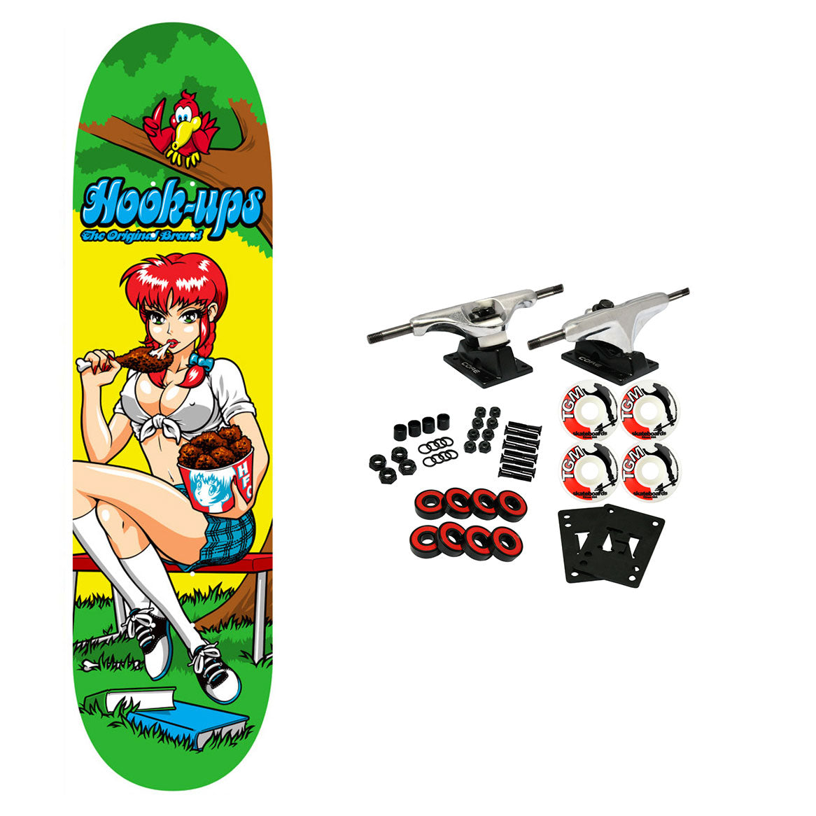 Hook Ups skateboard decks are made with premium 7-Ply North American Maple. Comes with Core trucks, 52mm TGM logo wheels, Amp abec 5 bearings, Black Diamond Griptape, risers, and hardware. Core trucks are light weight and feature heavy duty aluminum with grade 8 steel kingpins and axles, as well as USA made bushings and pivot cups. 52mm 99A are the perfect wheels for both street and park skating. Like the name states, Amp bearings are stimulants for your wheels! Light synthetic oil, Delrin Crowns, and Rubber Serviceable Shields are a few of the things that makes these bearings one of the best Abec 5 rated bearings on the market. Arrives un-assembled which allows for customization and a feeling of accomplishment. Skaters love building their boards! Easy to assemble!