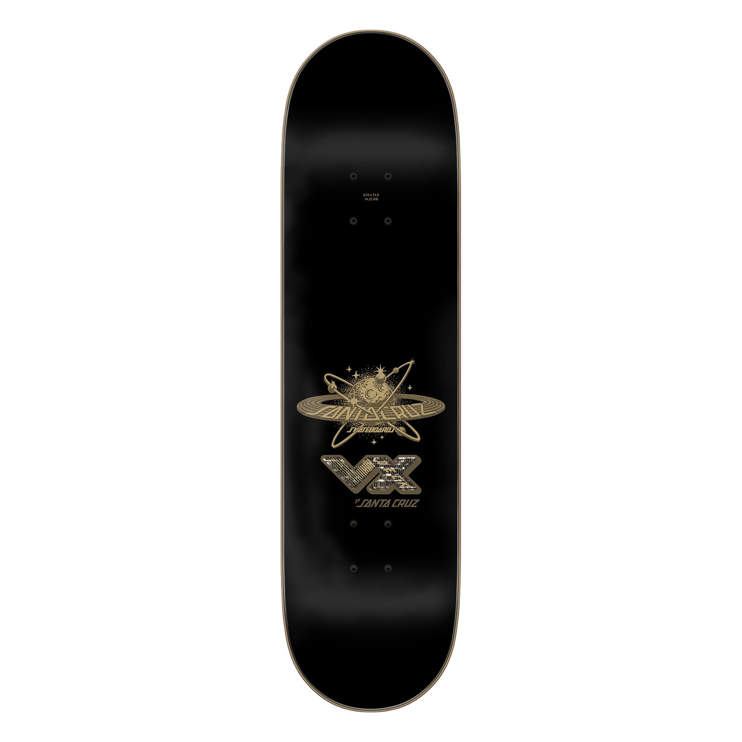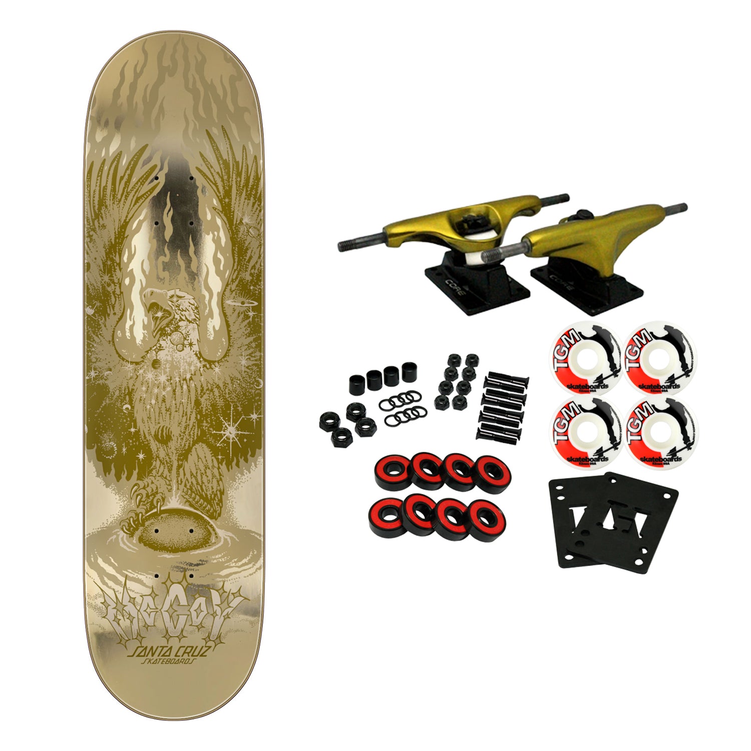 The Santa Cruz Skateboards McCoy Cosmic Eagle VX Twin Pro deck features Maurio's custom, symmetrical twin shape, VX deck construction, 14.22" wheelbase and metallic gold McCoy Cosmic Eagle graphics. This board measures 8.25" x 31.83" with a 14.22" wheelbase. VX decks are thinner, stronger, and have more pop than standard 7 ply decks featuring 5 plies of North American Maple and 2 layers of Quad X technology. Comes with Core trucks, 52mm TGM logo wheels, Amp abec 5 bearings, Black Diamond Griptape, risers, and hardware. Core trucks are light weight and feature heavy duty aluminum with grade 8 steel kingpins and axles, as well as USA made bushings and pivot cups. 52mm 99A are the perfect wheels for both street and park skating. Like the name states, Amp bearings are stimulants for your wheels! Light synthetic oil, Delrin Crowns, and Rubber Serviceable Shields are a few of the things that makes these bearings one of the best Abec 5 rated bearings on the market. Arrives un-assembled which allows for customization and a feeling of accomplishment. Skaters love building their boards! Easy to assemble!