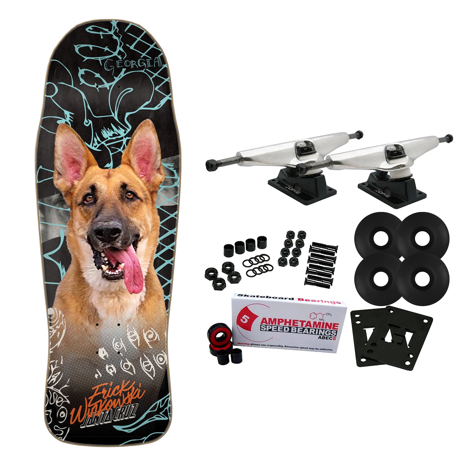 The Santa Cruz Skateboards Winkowski Tribute Pro Shaped deck is a tribute to Erick's friend Georgia. Digitally printed in color on bottom and black and white on deck top. On Erick's custom shape with a 15" wheelbase. Photo and artwork by Erick Winkowski. This board measures 10.34" x 30.54" with a 15" wheelbase. 7 ply North American Maple pressed individually using epoxy - making a strong, responsive deck with long lasting pop and consistent concave and kick. Comes with Core trucks, 58mm 97A wheels, Amp abec 5 bearings, Black Diamond Griptape, risers, and hardware. Core trucks are light weight and feature heavy duty aluminum with grade 8 steel kingpins and axles, as well as USA made bushings and pivot cups. 58mm 97A are the perfect wheels for both street and park skating. Like the name states, Amp bearings are stimulants for your wheels! Light synthetic oil, Delrin Crowns, and Rubber Serviceable Shields are a few of the things that makes these bearings one of the best Abec 5 rated bearings on the market. Arrives un-assembled which allows for customization and a feeling of accomplishment. Skaters love building their boards! Easy to assemble!