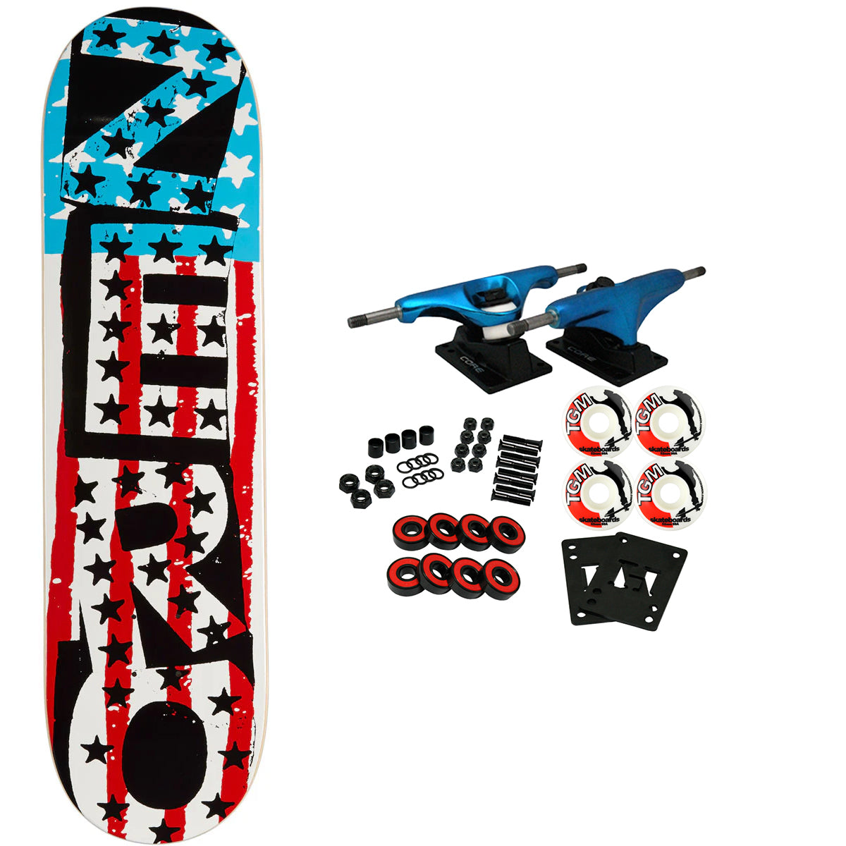 Zero decks are constructed with 7-Ply North American Maple. This board measures 8.25" x 31.9" with a 14.25" wheelbase. Assorted Top Ply. Comes with Core trucks, 52mm TGM logo wheels, Amp abec 5 bearings, Black Diamond Griptape, risers, and hardware. Core trucks are light weight and feature heavy duty aluminum with grade 8 steel kingpins and axles, as well as USA made bushings and pivot cups. 52mm 99A are the perfect wheels for both street and park skating. Like the name states, Amp bearings are stimulants for your wheels! Light synthetic oil, Delrin Crowns, and Rubber Serviceable Shields are a few of the things that makes these bearings one of the best Abec 5 rated bearings on the market. Arrives un-assembled which allows for customization and a feeling of accomplishment. Skaters love building their boards! Easy to assemble!