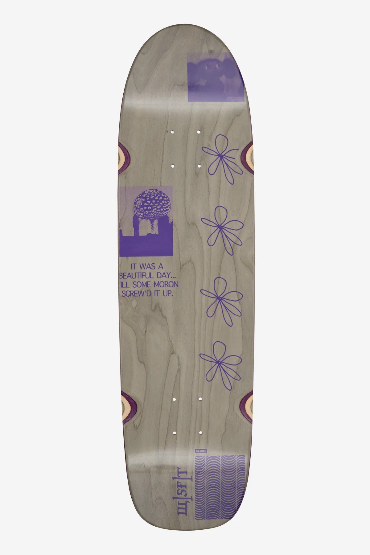 Shaped deck for having a good time whilst shredding The Shooter 8.6" Deck in Misfit/Purple Prose is a shaped deck constructed from Resin-7 Canadian maple. It has mellow side to side concave, a steep nose and tail kick, with Laser-etch details on top and custom graphics from M/SF/T.