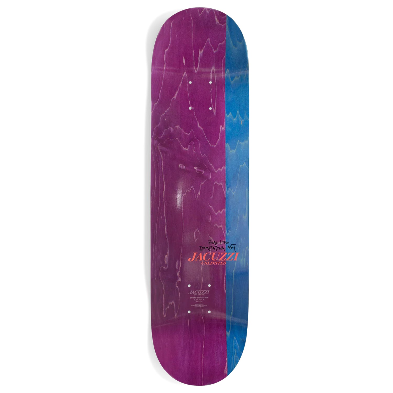 JacuzziUnlimited Skateboard decks are made with 7-ply 100% North American Maple with Epoxy Glue. Individually Pressed. Stronger than industry 7-ply. Strong pop. Long deck life. This board measures 8.375" x 31.6" with a 14.2" wheelbase.