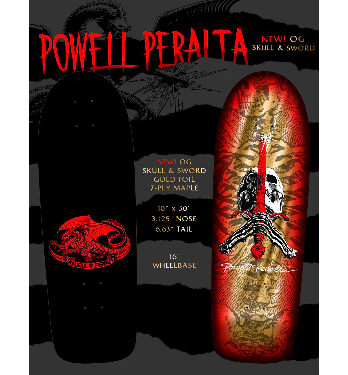 Powell Peralta Skateboard Deck Rodriguez Skull and Sword Gold Foil Old School Reissue