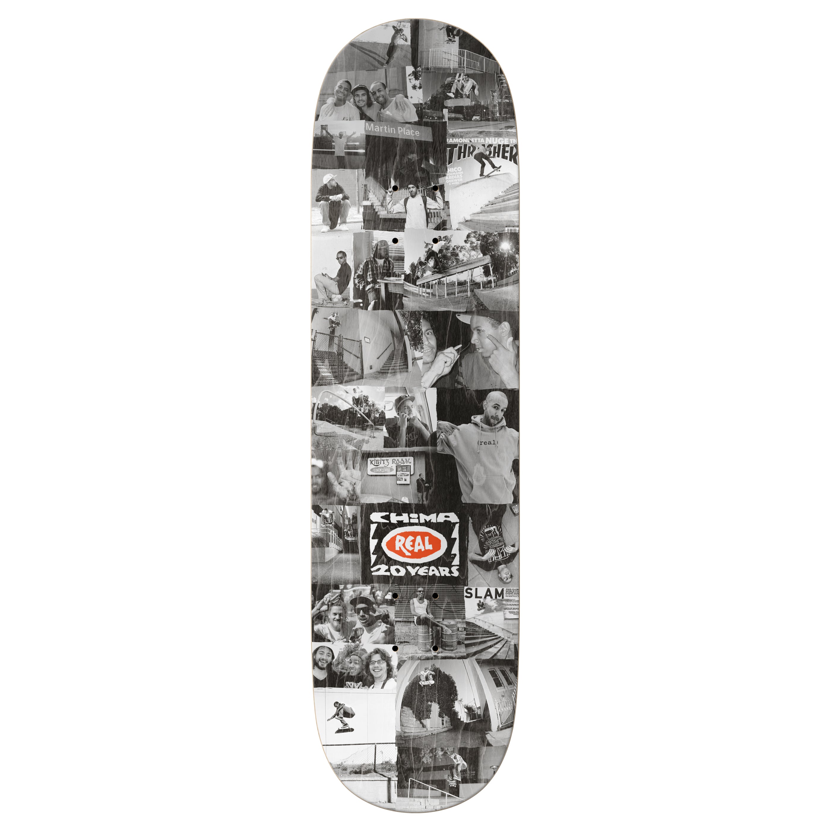 Pearlescent ink over white background. Custom top graphic collage. Constructed with Premium, 7-Ply North American Maple. Assorted Top Stains. Measures 8.25" x 32" with a 14.38" wheelbase.