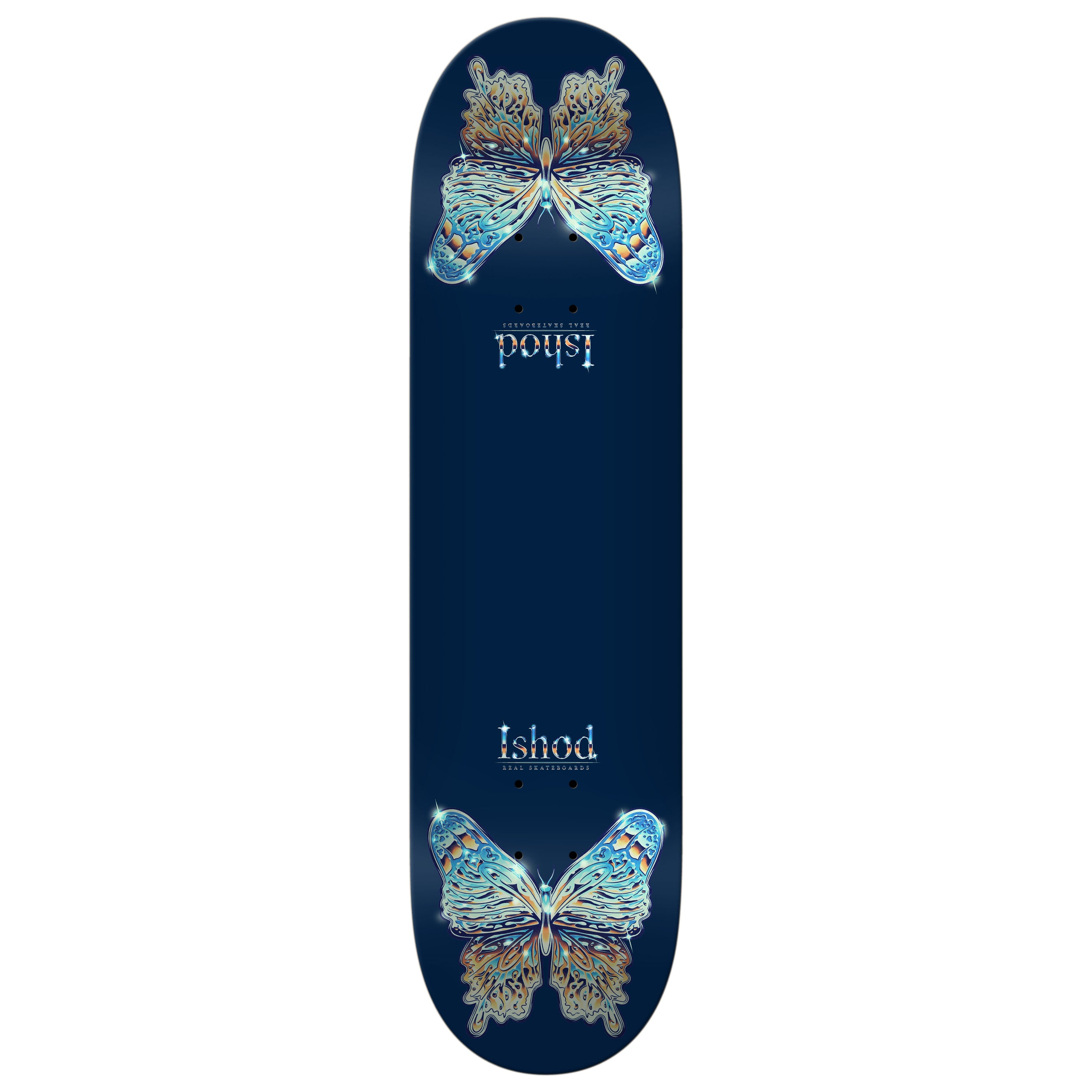 Ishods Twin Tail Shape. Silver Foil behind type and butterflies. Constructed with Premium, 7-Ply North American Maple. Assorted Top Stains. Measures 8.25" x 31.8" with a 14.3" wheelbase.