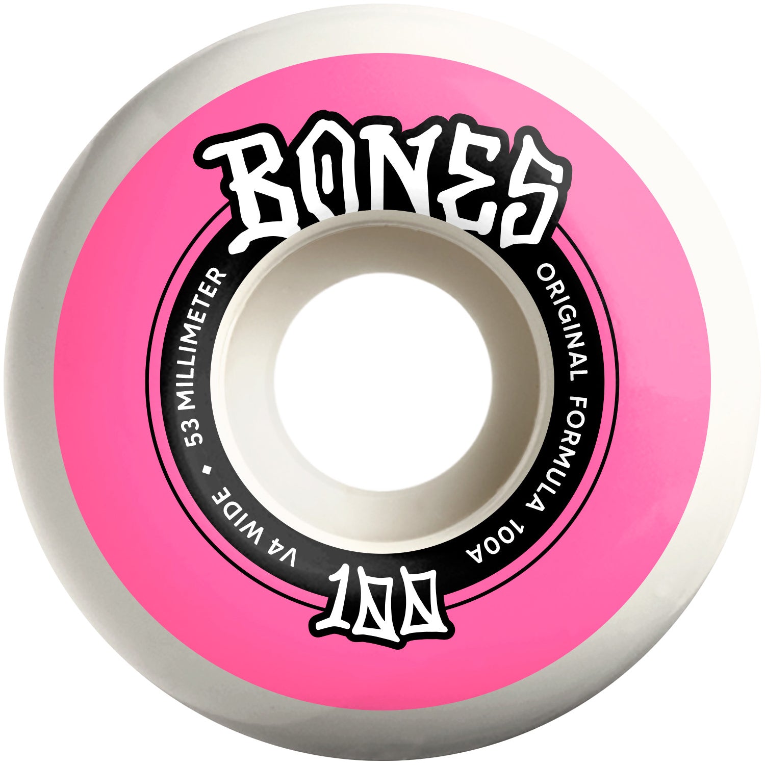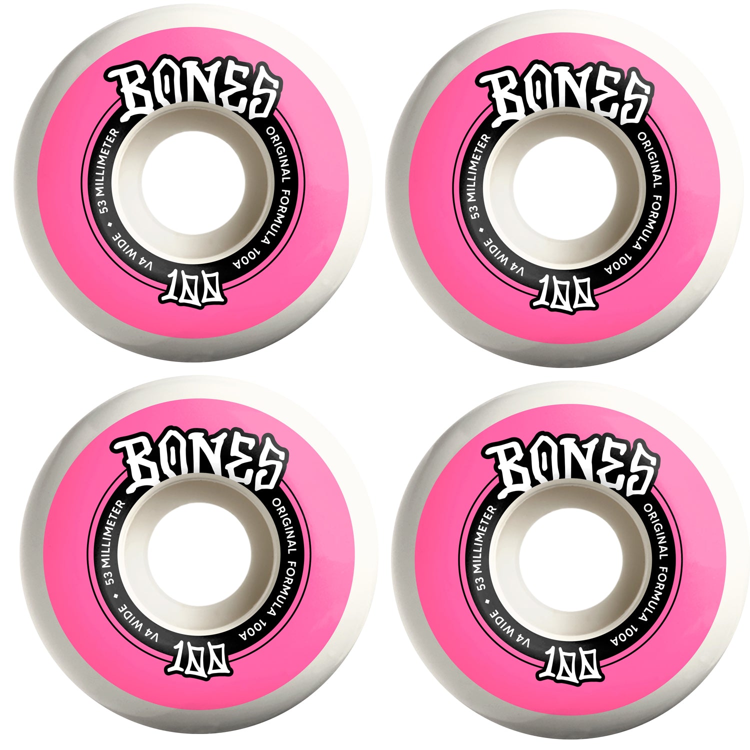 These Bones wheels feature the V4 Wide shape, poured with the original 100A formula. These Wheels Measure 53mm x 34mm. The V4 wide shape has a wider contact patch for greater stability and solid landings.