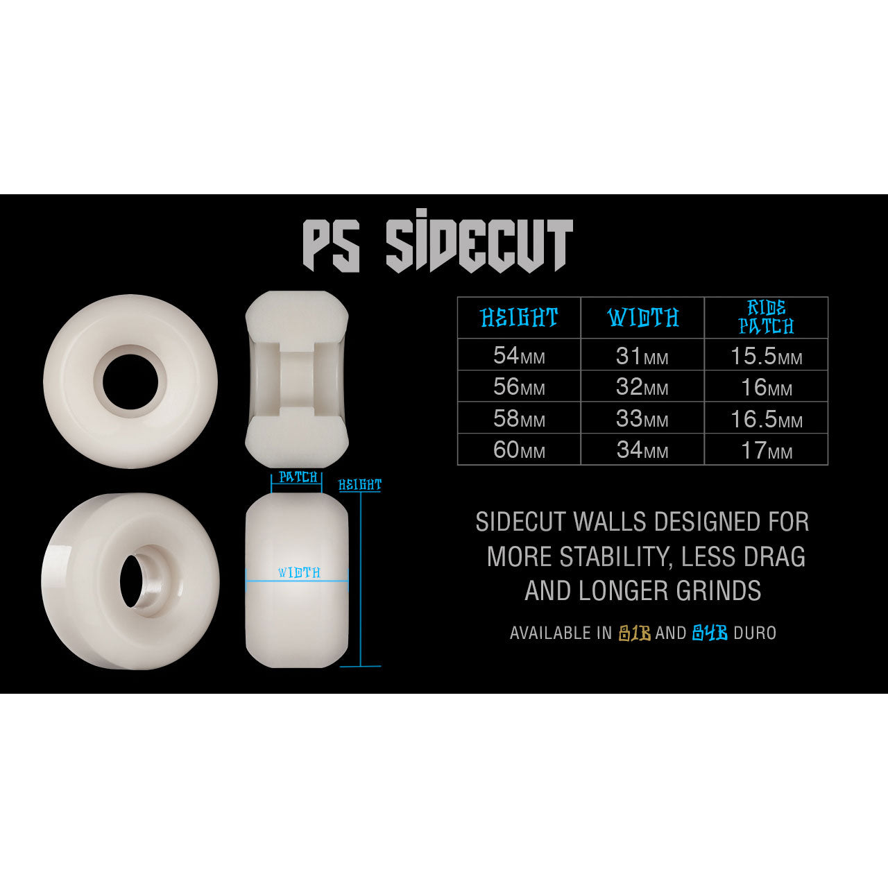 These wheels measure 56mm x 32mm on the P5 Sidecut shape in 81B Durometer. 81B is roughly equivalent to 101A.