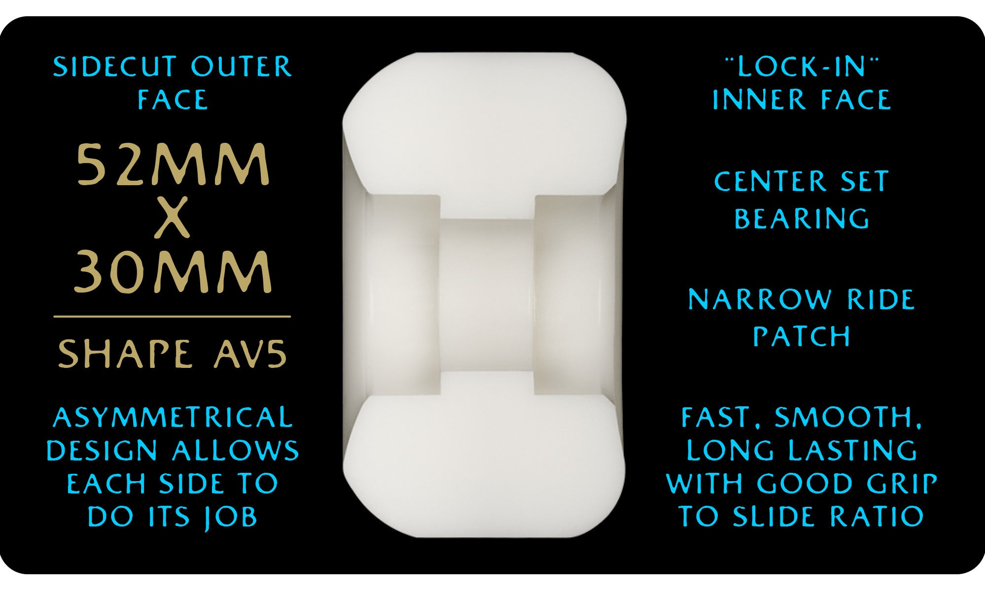 ABOUT THE AV5 NANO RAT SHAPE: Sidecut outer face. Asymmetrical design allows each side to do its job. "Lock-in" inner face. Center set bearing. Narrow ride patch.