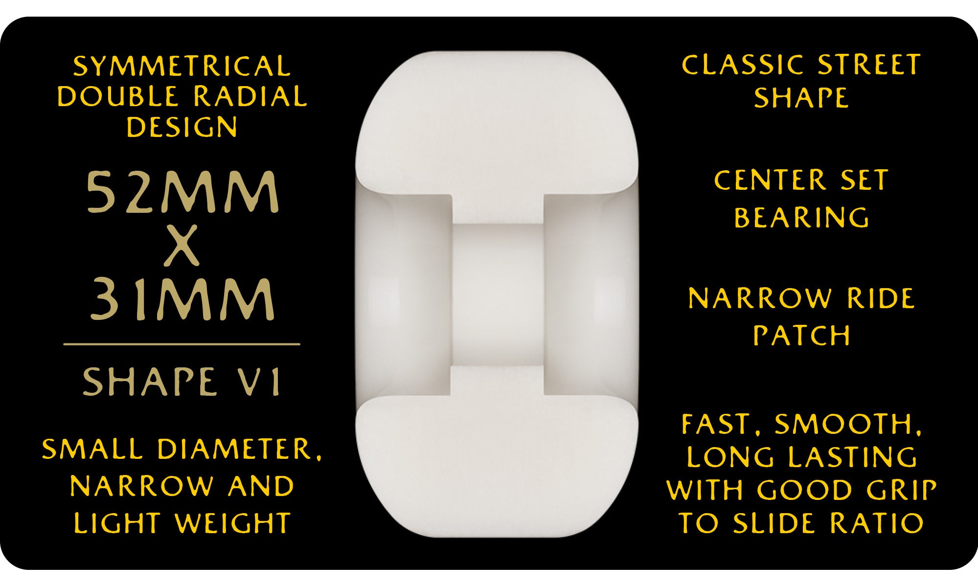 ABOUT THE V1 SHAPE: Symmetrical double radial design. Classic street shape. Small diameter, narrow and light weight. Center set bearing.