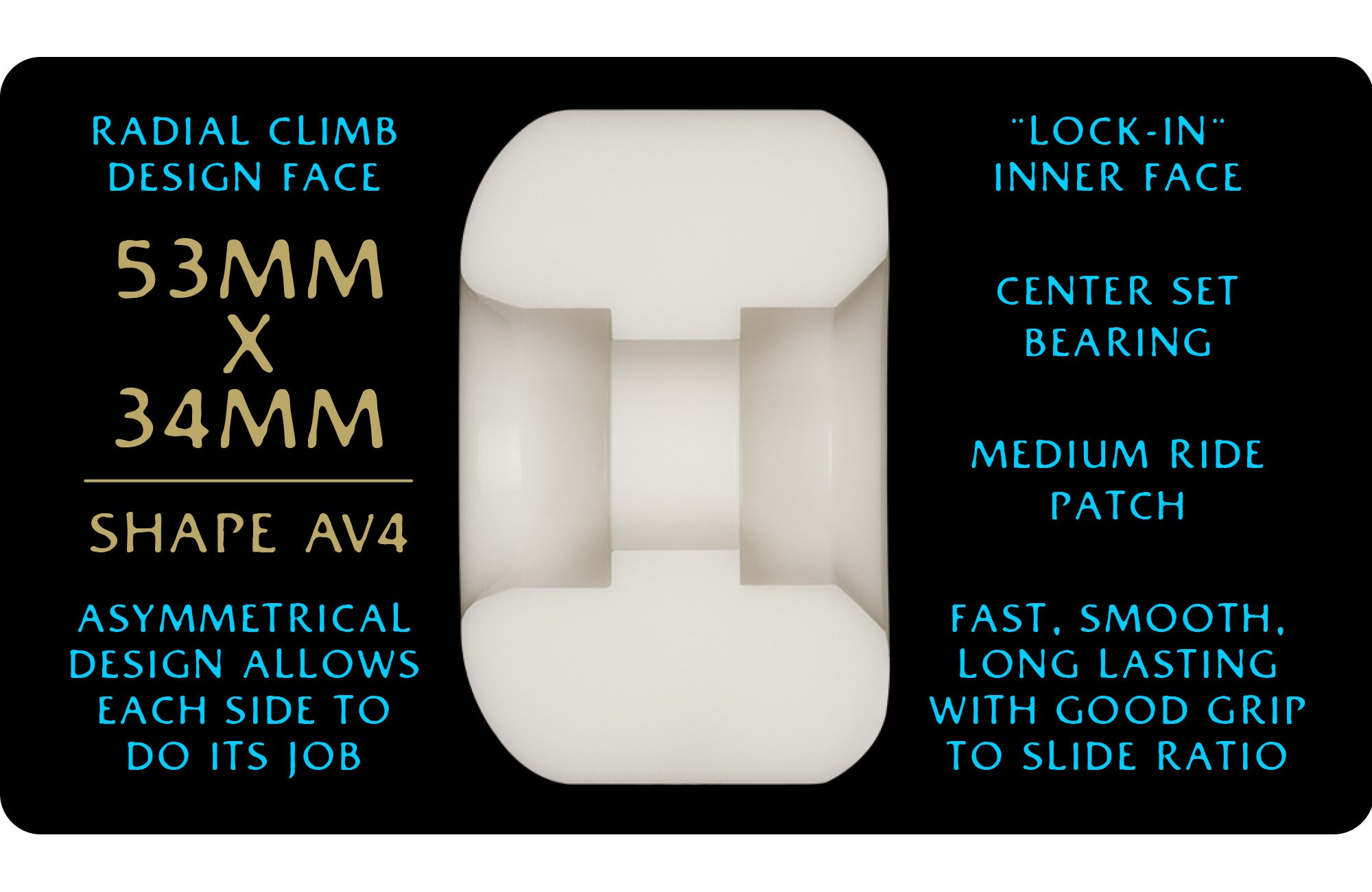 ABOUT THE AV4 NANO RAT SHAPE: Radial climb design face. Asymmetrical design allows each side to do its job. "Lock-in" inner face. Center set bearing. Medium ride patch.