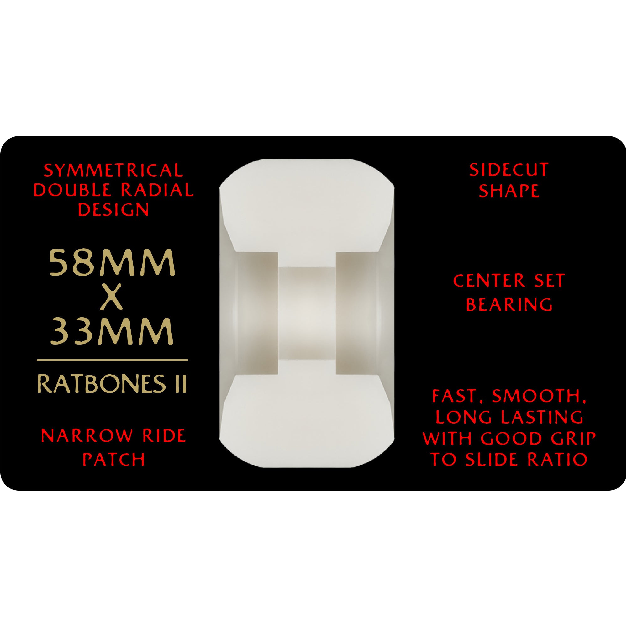 The Ratbones II shape is symmetrical and features a narrow ride patch and smooth wheel surface.