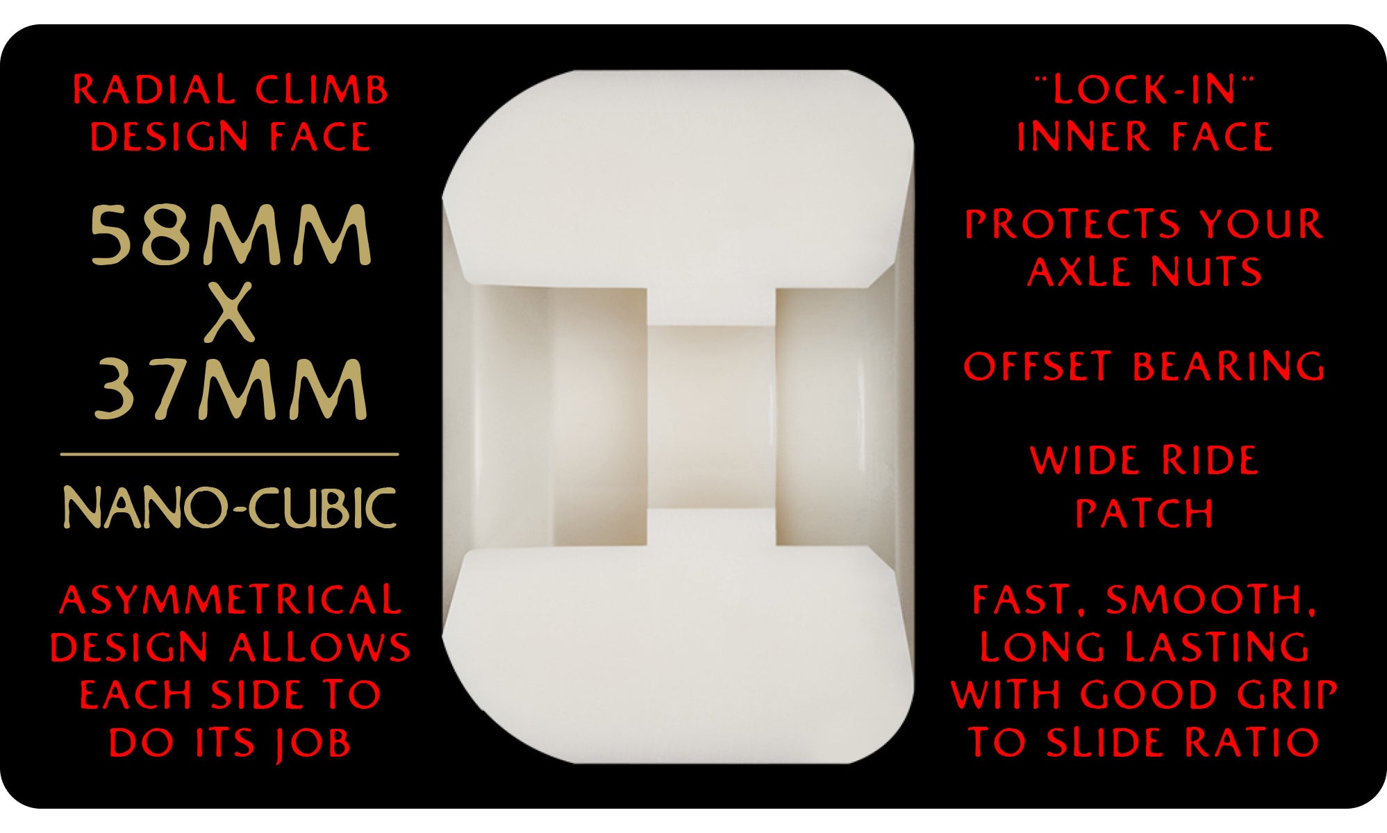 NanoCubics are inspired by and developed for Andy Anderson to help him expand his wide range of street, park and freestyle tricks on all terrains. NanoCubics feature the same classic design advantages, of the legendary Cubic and MiniCubic, reconceived for today's skating, and utilizing a special version of our amazing new Dragon formula. The NanoCubic's offset design allows it to have the perfect shape for both inner and outer edges to skate a wider range of obstacles. NanoCubics are smaller, lighter, and offset, so their large outer edge rolls up curbs, walls, and over cracks, and it covers your axle and nuts. The inner edge locks onto rails but releases when you need to.