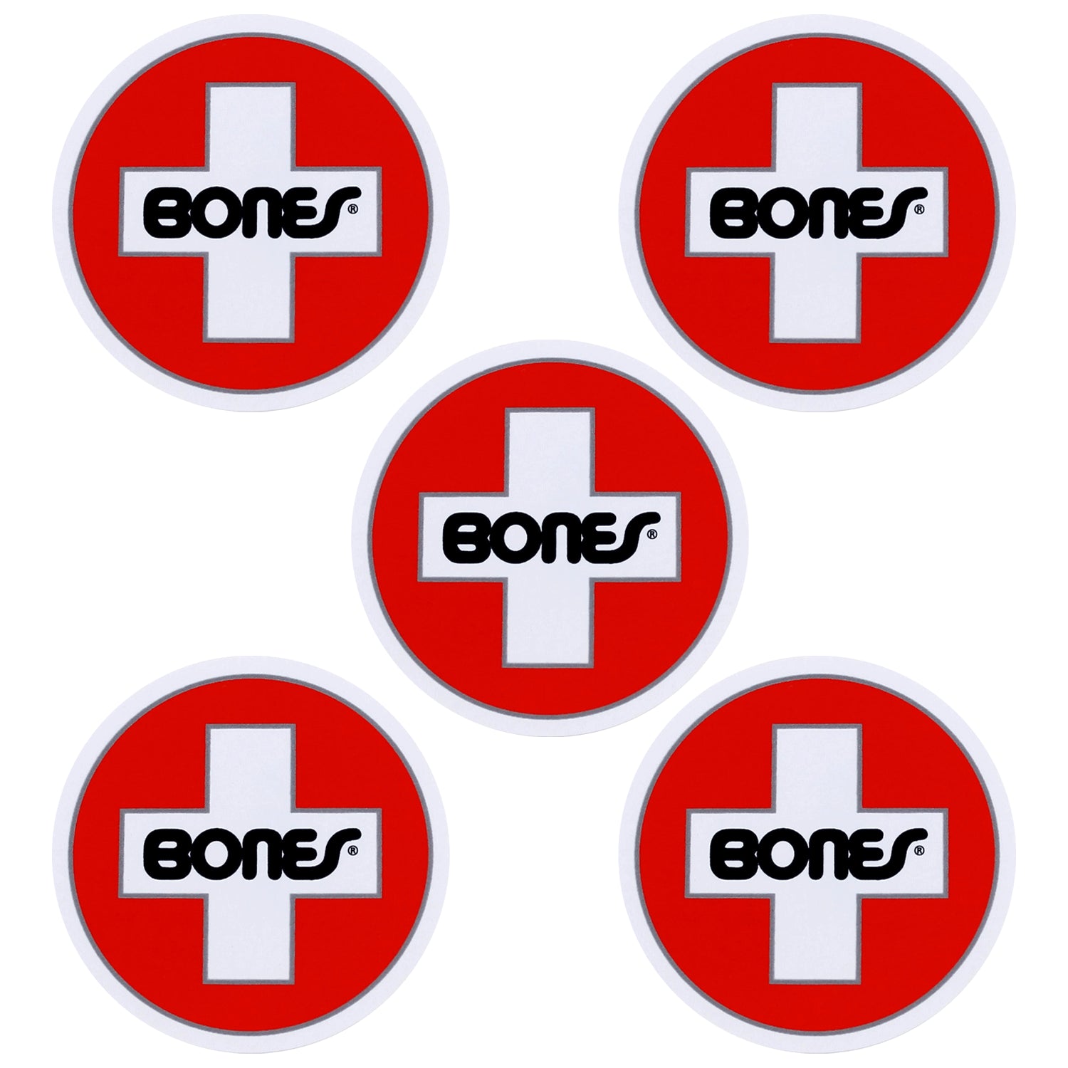 Pack includes 5 Stickers. The classic Swiss sticker from Bones Bearings. This sticker measures 3" in diameter. Made from high quality vinyl.