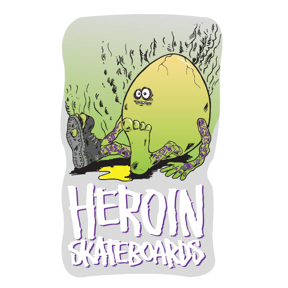 Heroin Skateboards Spring 2026 Premium Sticker. Sticker art featured on the Craig Questions Rotten Wide Boy deck graphic. Measures 3" x 6".