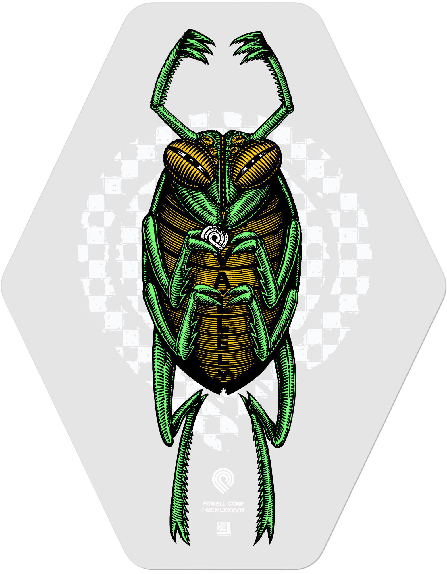 Powell-Peralta Mike Vallely Bug sticker with artwork by VCJ. Measures 4.5" x 5.6". Clear Mylar.