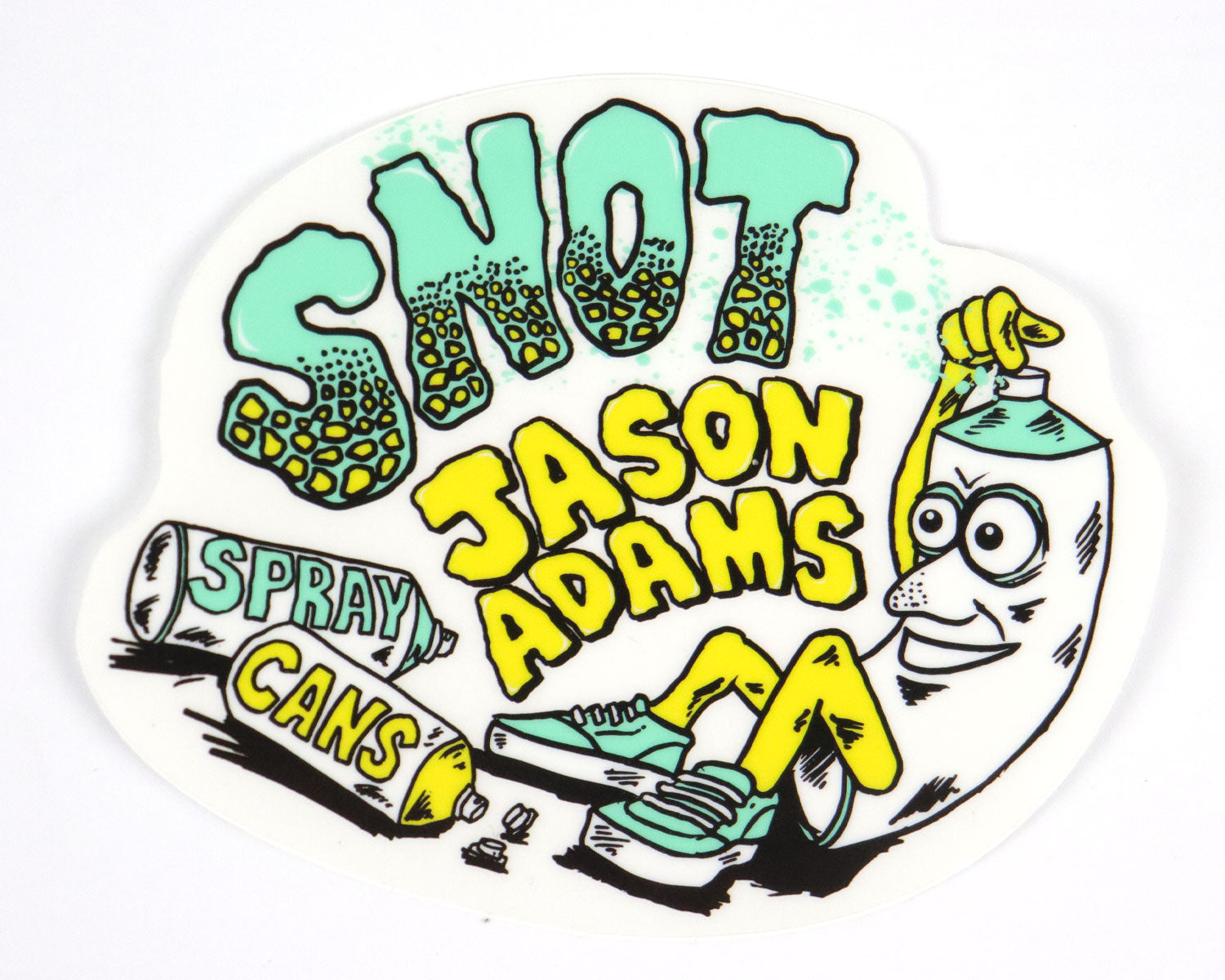 Snot Wheel Co. Sticker featuring Jason Adams Spray Cans graphics. Measures 4.5" x 3.5"