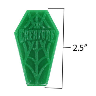 This is a small piece of coffin shaped wax from Creature Skateboards. This wax measures 2.5" x 1.5" x .5". This is a small piece of pocket wax, not a large block.