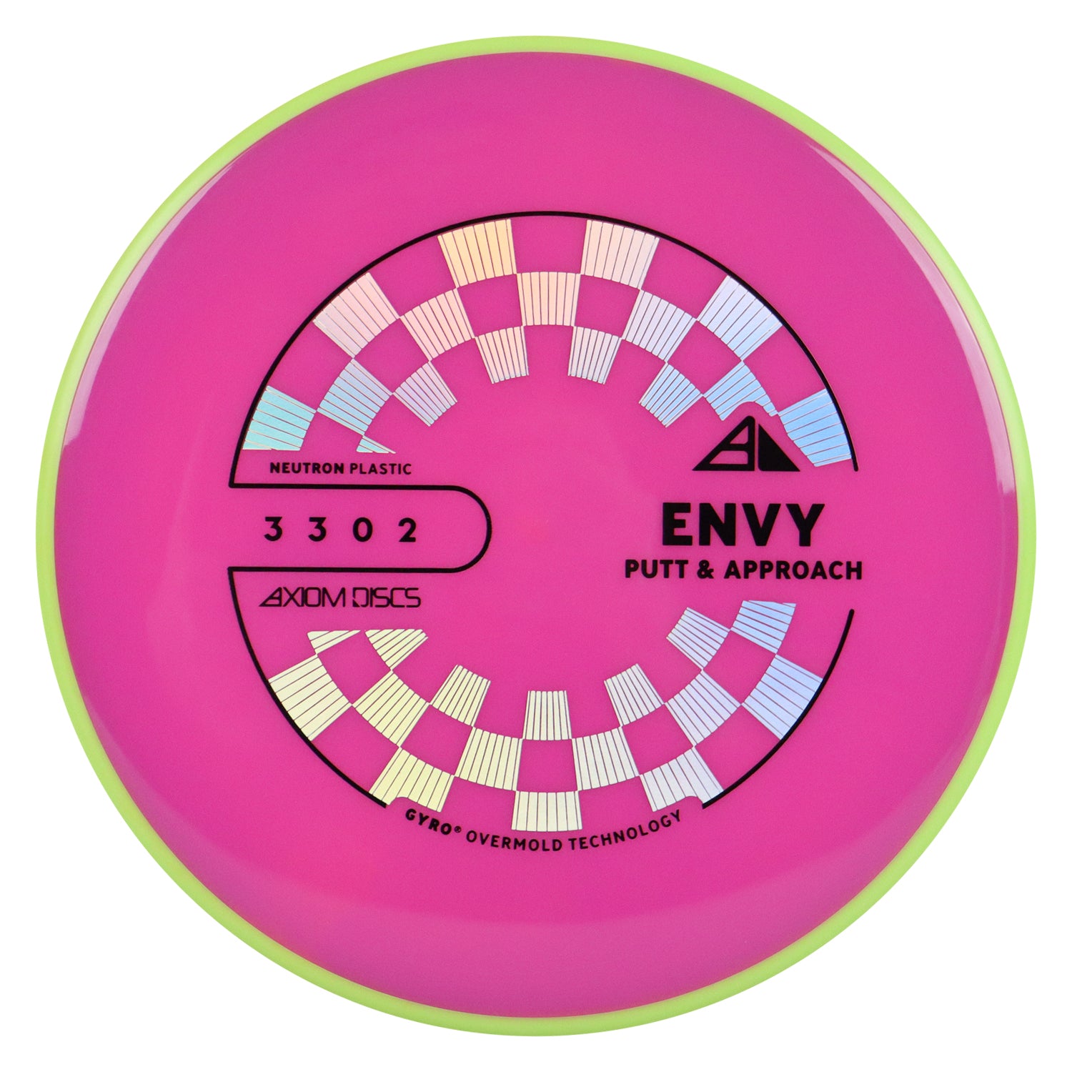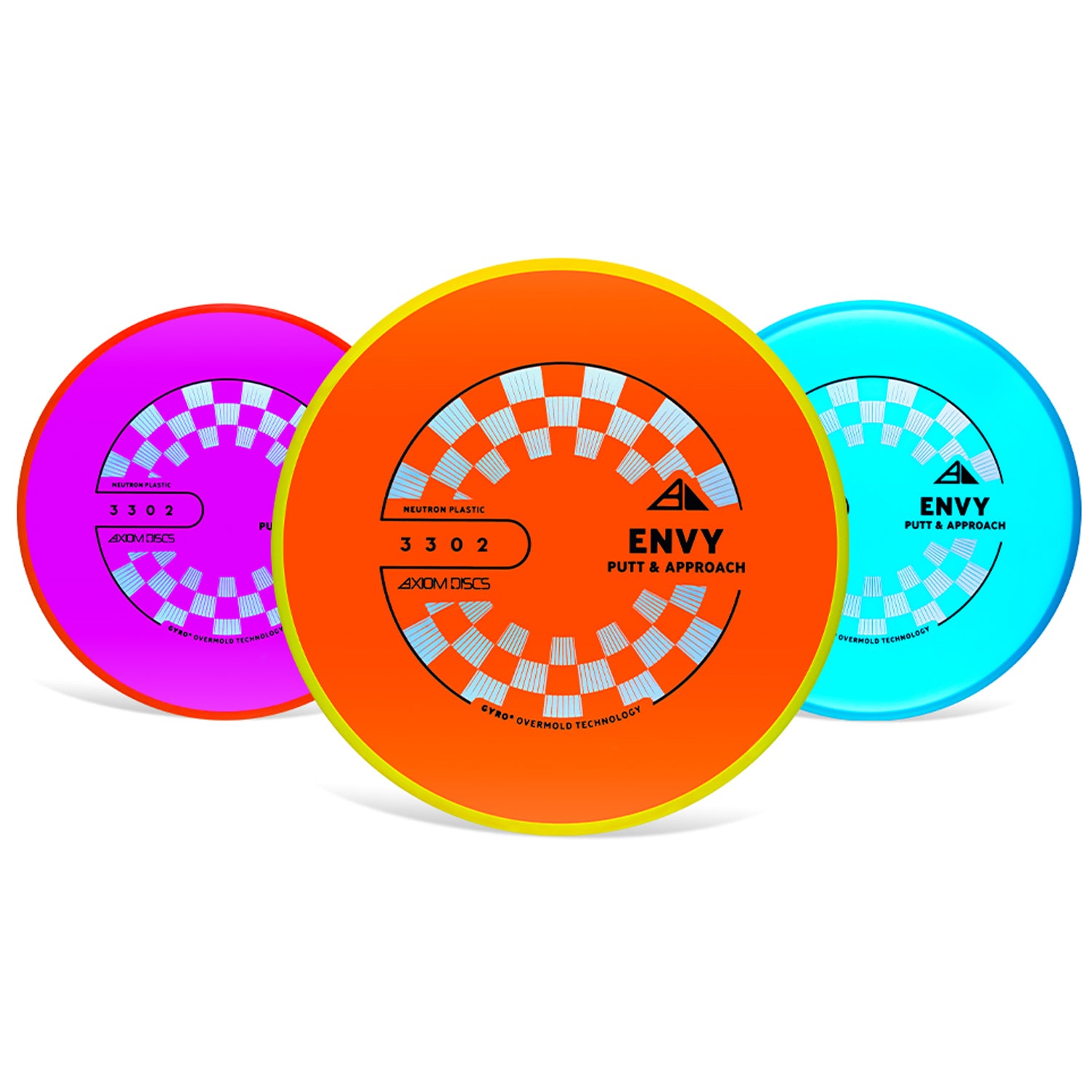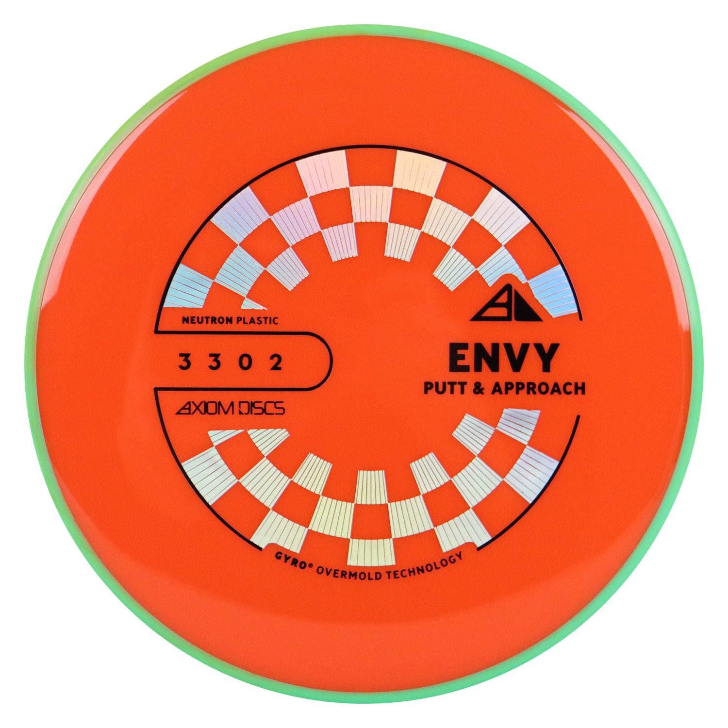 The Envy is a slightly overstable putt and approach disc. The Envy has a smooth modern feel that fits in the hand perfectly, lending confidence for both putt and approach duties. The Envy exhibits reliable high-speed stability and a minimal fade. With a slightly lower profile and cruising speed than the Ion and Anode class, the Envy is a uniquely “lid-like” stable putter.