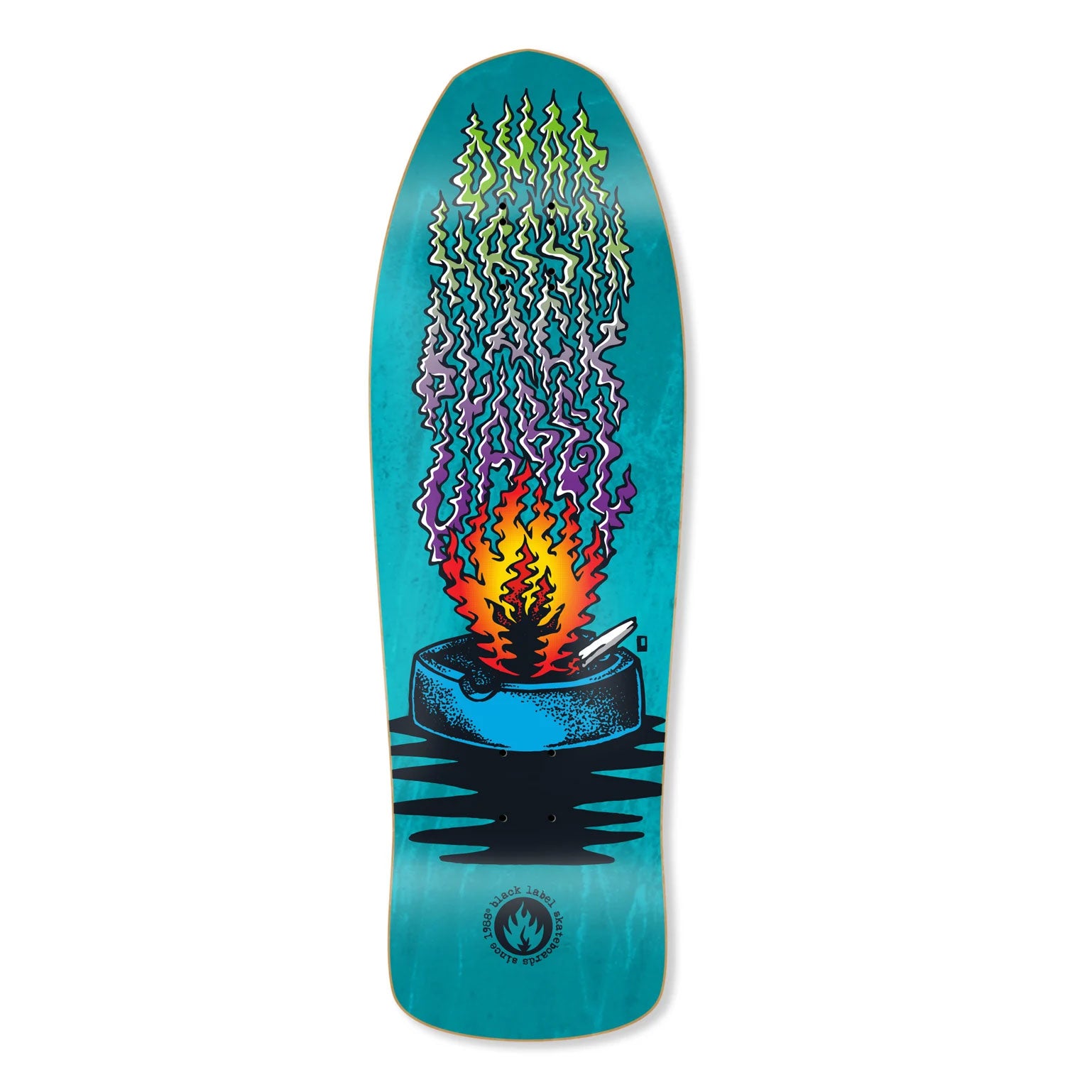 Black Label Old School Skateboard Omar Hassan Ashtray Deck.Custom 12XU Shape with Aqua Stain, and Original Artwork by John Lucero.Deck measures 10" x 31.25" with adjustable wheelbase Double-drilled wheelbase 14.5" or 15".