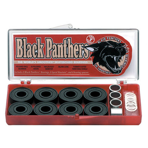 Black Panthers; Genuine 100% Teflon Oil, Delrin Core, Rubber Coated Removable Shield, Polished Bearings, Polished Races. Each set includes free bearing spacers and speed washers.